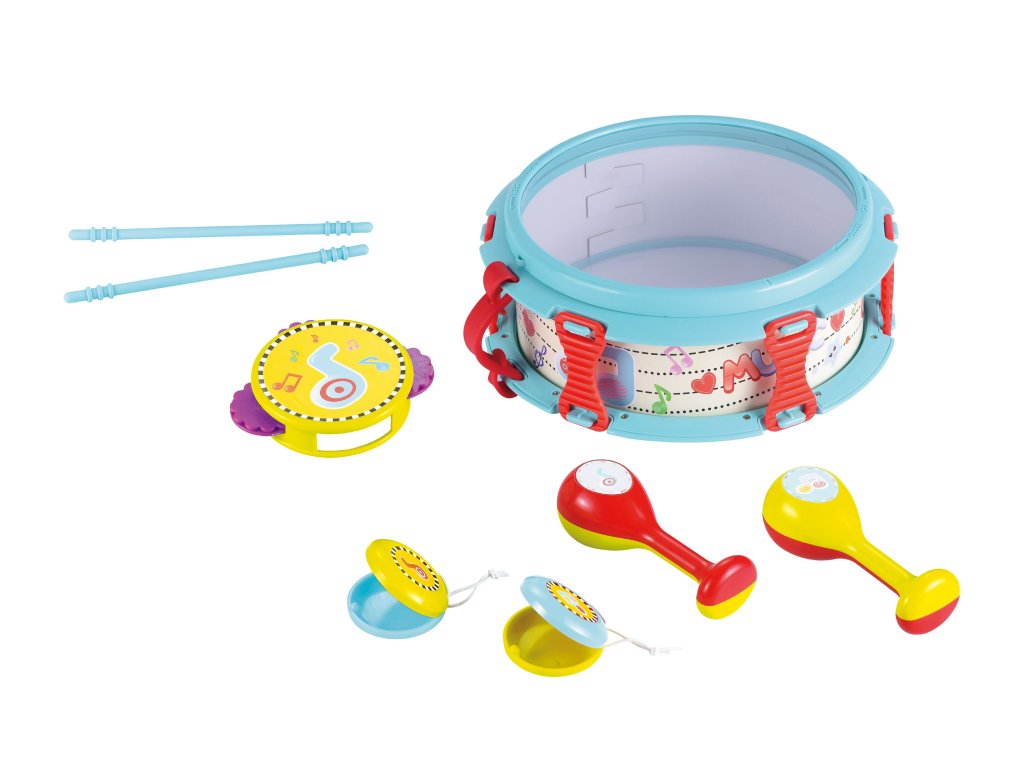 Hudební nástroje sada. Obsahuje buben, rumba koule, kastaněty, tamburínu, paličky na bubnování. Velikost bubnu 27cm.