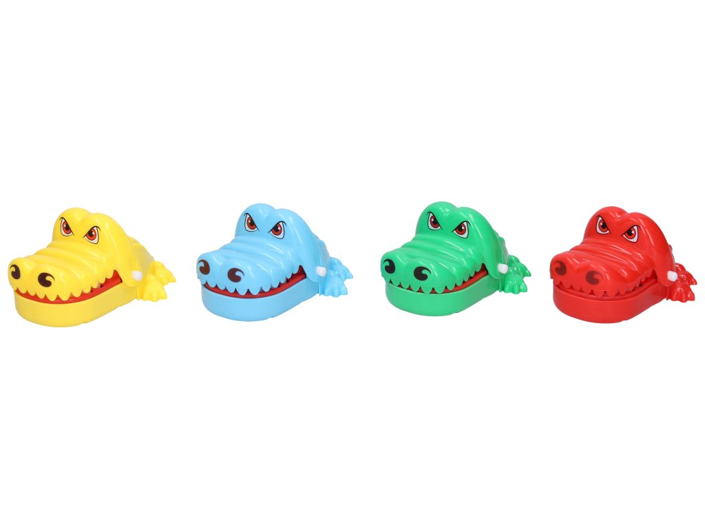 Kousající krokodýl hra 11 cm. Display box - 12 ks. Rozměry 11x7,5x5,5cm. 4 barevné varianty - modrá, zelená, červená, žlutá. Mačkáním zubů v otevřené krokodýlově tlamě se tlama při zmáčknutí náhodného zubu zavře.