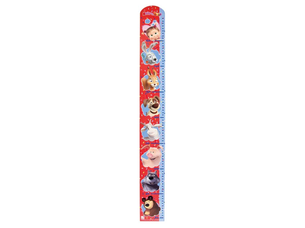 Barevný metr vyrobený z MDF-desky potištěný vtipnými motivy ze známého dětského seriálu „Máša a medvěd“ je skvělou dekorací do každého dětského pokoje. Malý otvor v záhlaví umožňuje snadné připevnění na zeď. Tištěná stupnice pro měření je v rozmezí od 80 cm do 160 cm výšky.