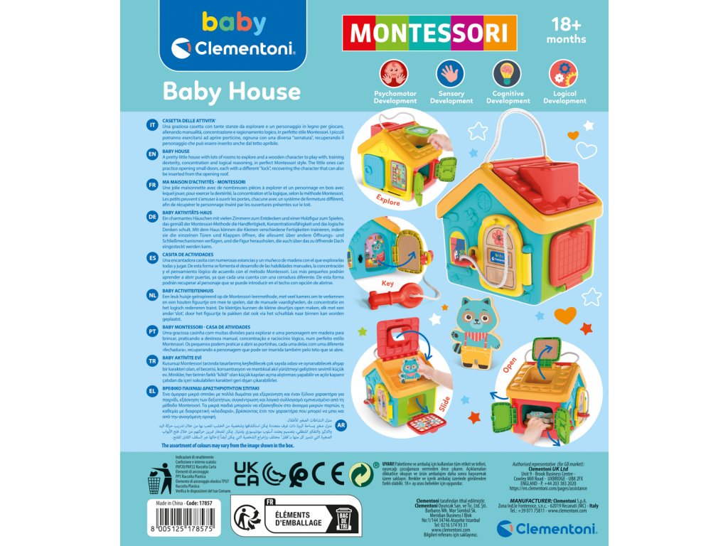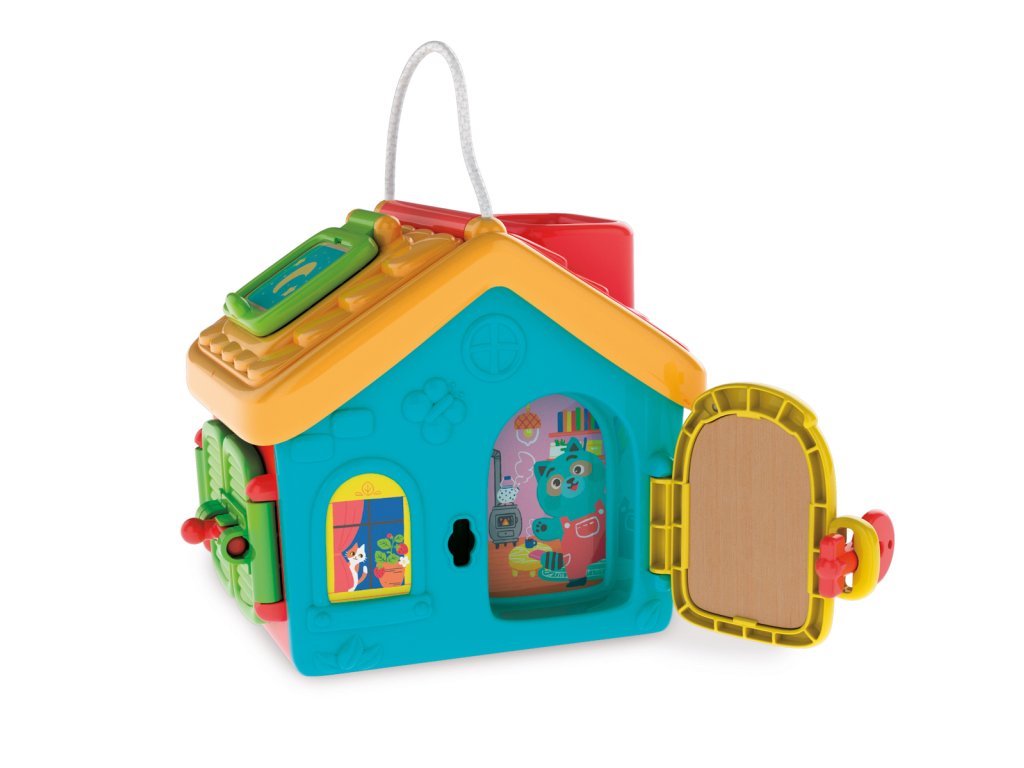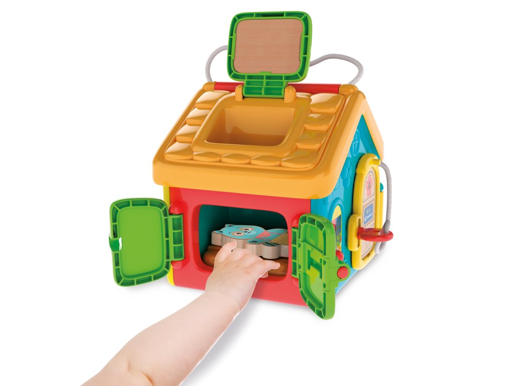 Interaktivní sada - domeček s mnoha různými funkcemi a figurkou na hraní. Hračka inspirovaná Montessori metodou plní funkci skutečné cvičební sady, která zlepšuje jemnou motoriku a zároveň učí používat předměty každodenní potřeby. Dítě, které objevuje vnitřek domečku, procvičuje schopnost otevřít všechna dvířka a různé uzávěry. Balení: 21x24x17cm. Věk: 18m+