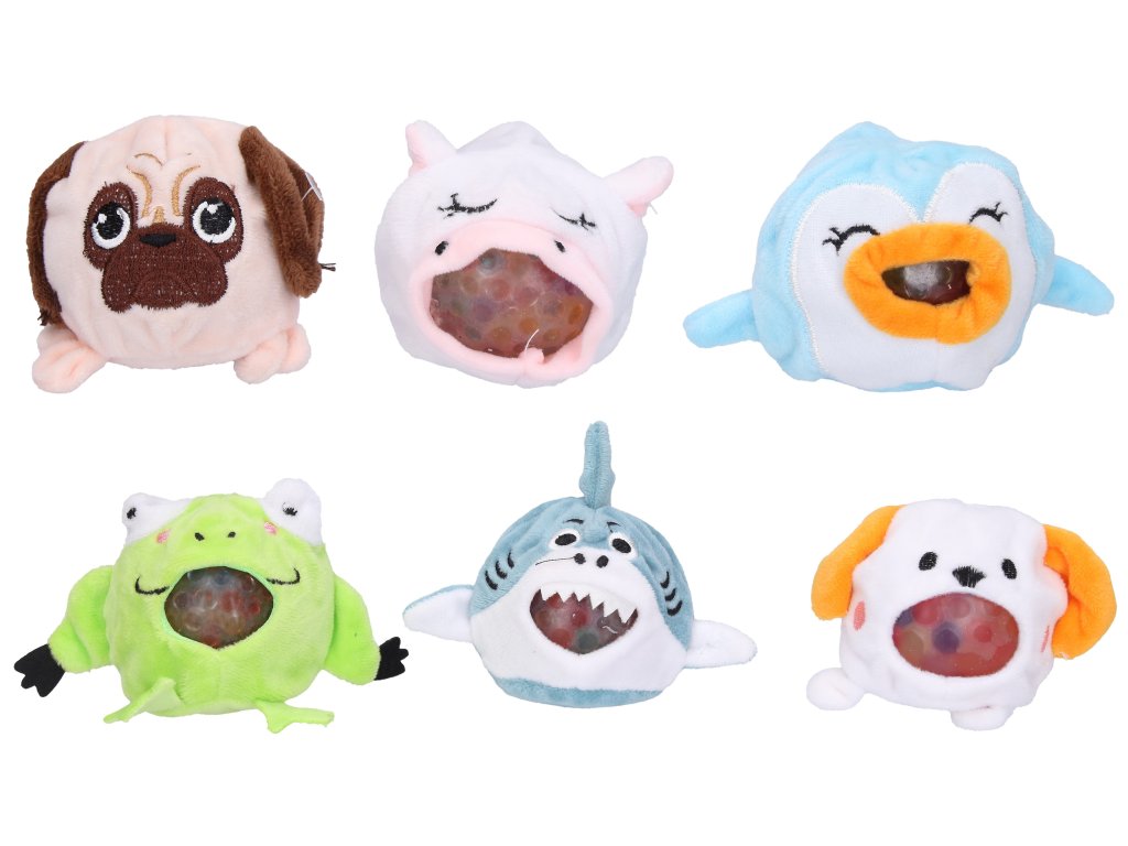 Zvířátko mačkací. Velikost 7 cm. 12 ks display box. 6 variant - žába, žralok, pes hnědý, pes bílý, tučňák, kráva.