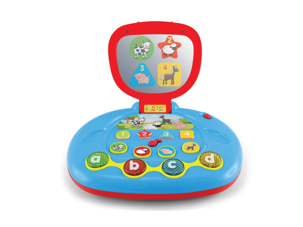 Dětský počítač - mluví česky. Rozměry 20x16 cm. Světelné a zvukové efekty. 3xAA baterie součástí. Promítání (displej) v zrcátku. Přepínač - vypnuto, nižší, vyšší hlasitost. Výuka čísel, barev, písmen, tvarů, zvuky zvířátek, melodie (nota).