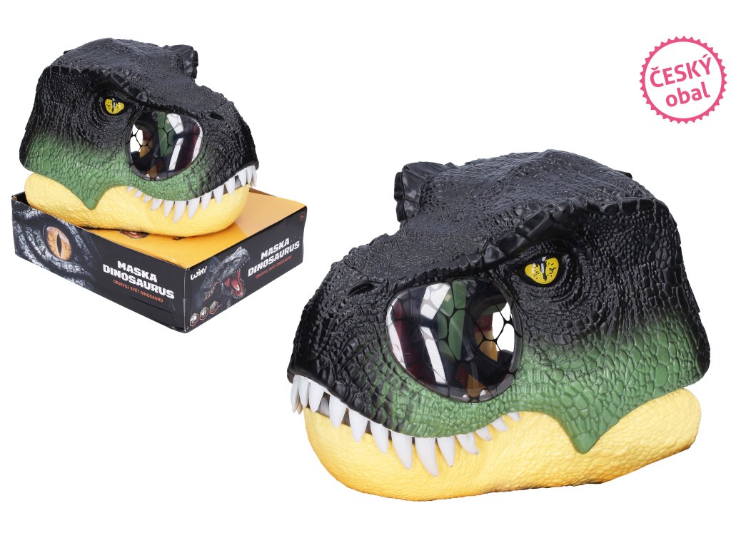 Maska na hlavu dinosaurus s efekty. Rozměry 28x22x21,5 cm. Pohybem hlavy se otevírá čelist, svítí oči a aktivuje se dinosauří řev. Světelné a zvukové efekty. 3xLR44 baterie součástí.
