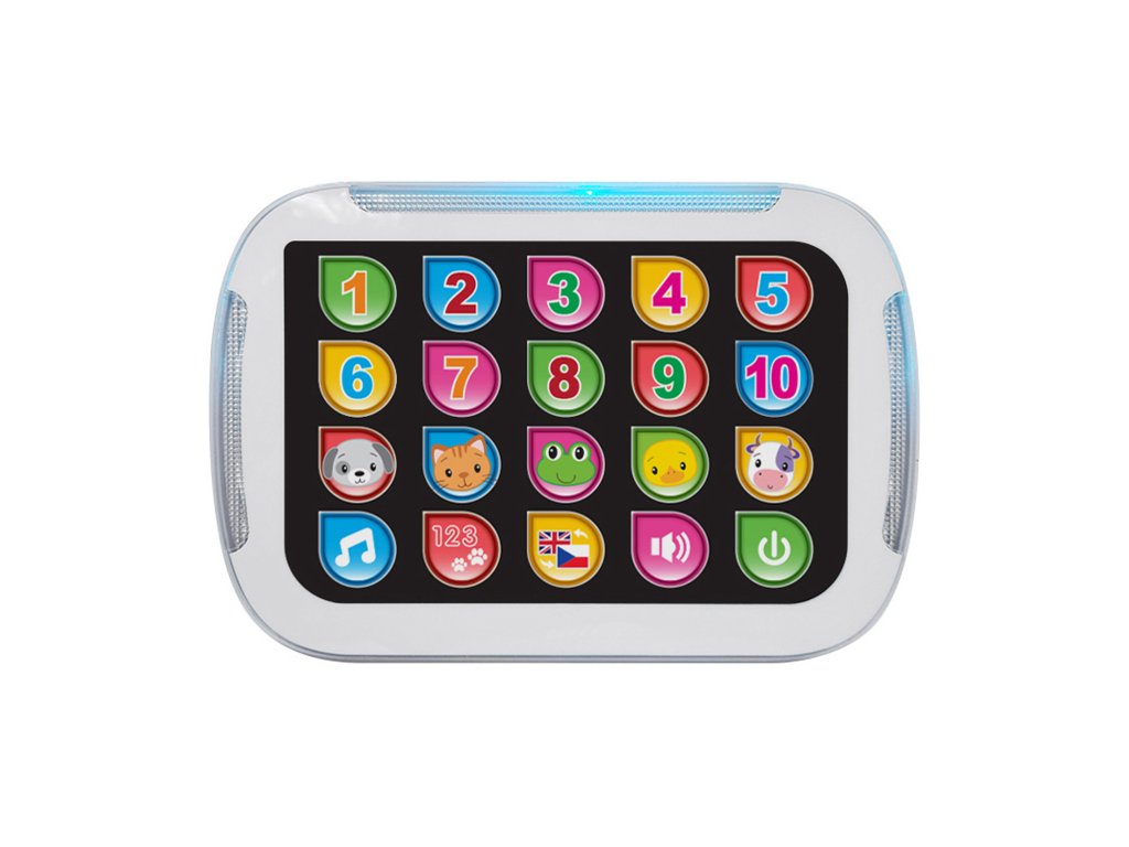 Tablet dětský - mluví česky. Rozměry 19x13 cm. Světelné a zvukové efekty. 3xAAA baterie součástí. Aktivace tlačítkem v pravém dolním rohu. Výuka čísel, zvířat, melodie, změna jazyka, nastavení hlasitosti.