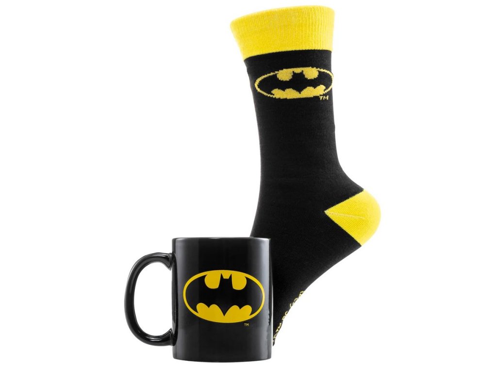 Dárkový set předmětů - hrnek s ponožkami, inspirovaný logem populárního superhrdiny Batmana. Set hrníčku a ponožek je dodávaný v dárkové krabičce se stejným motivem, a proto je celá sada vhodná jako dárek pro každého menšího i většího fanouška.