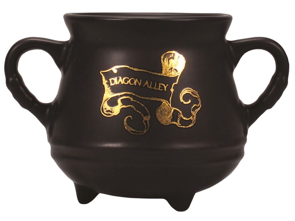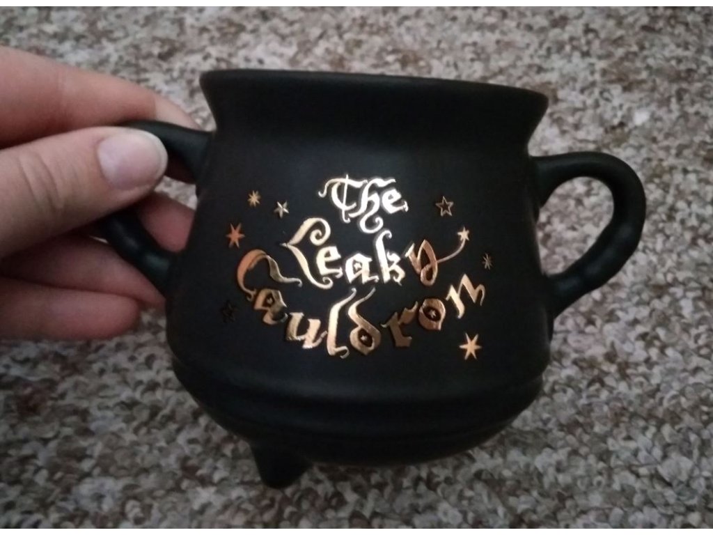 Černý keramický glazovaný hrnek s grafikou filmové ságyo Harrym Potterovi a nápisem The Leaky Cauldron.