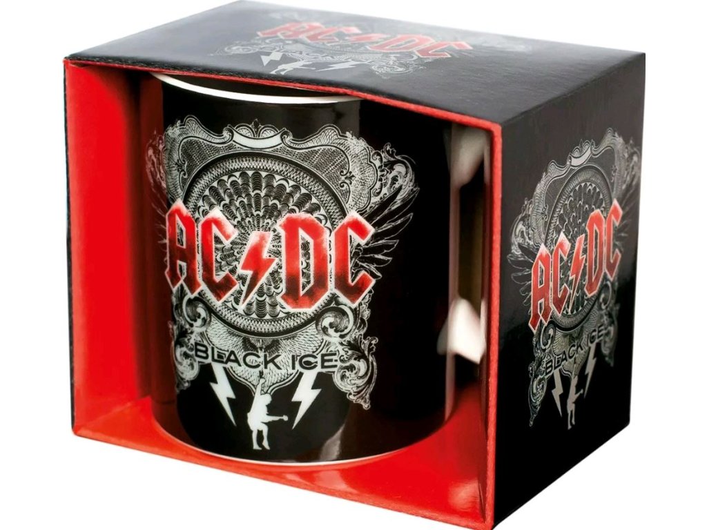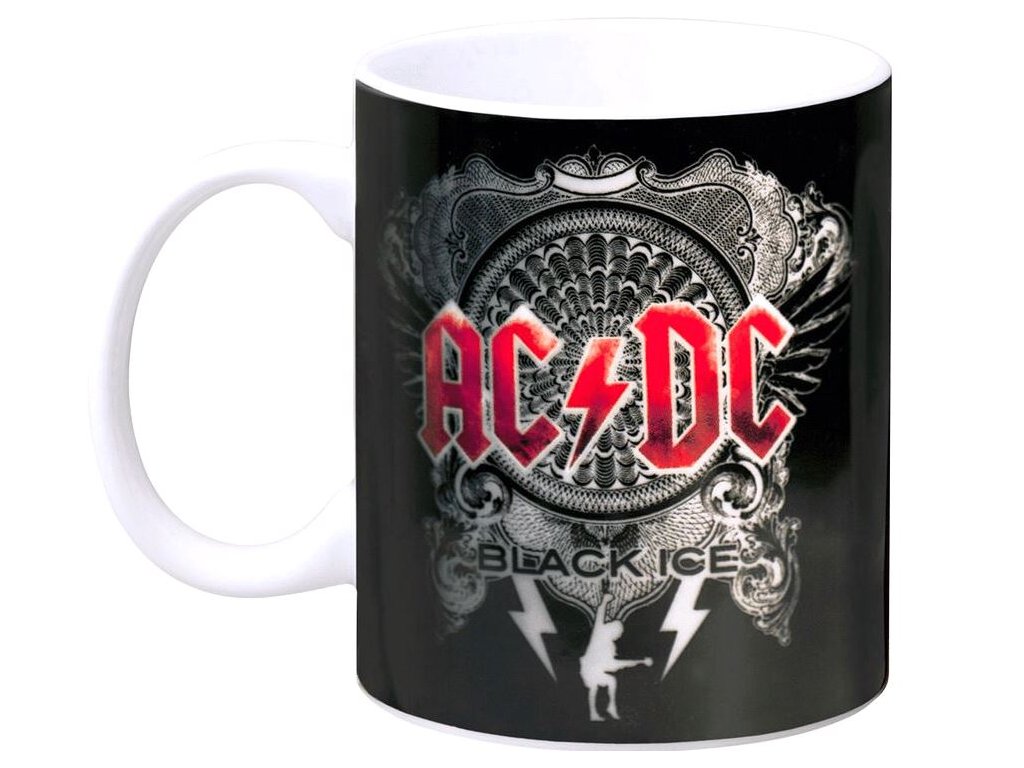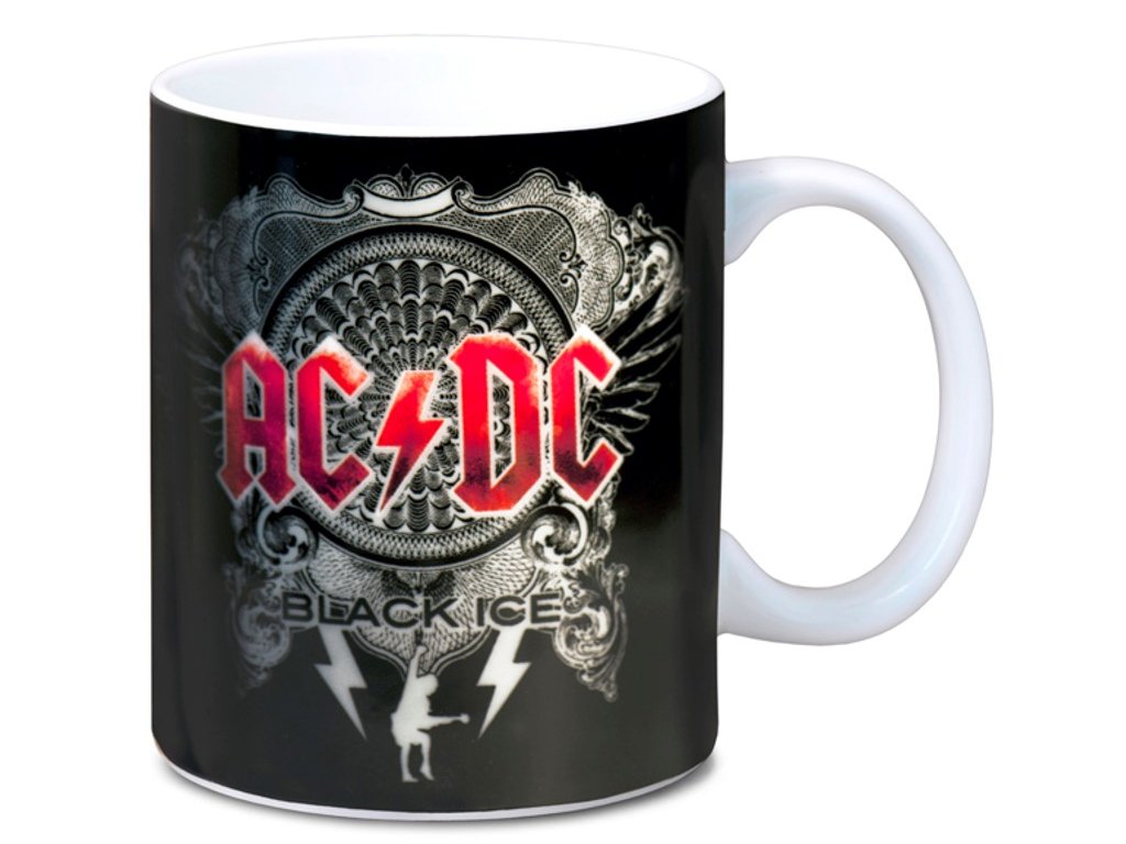 Keramický glazovaný hrnek s barevným potiskem loga slavné hard-rockové skupiny AC/DC a grafikou jejich patnáctého studiového alba Black Ice.