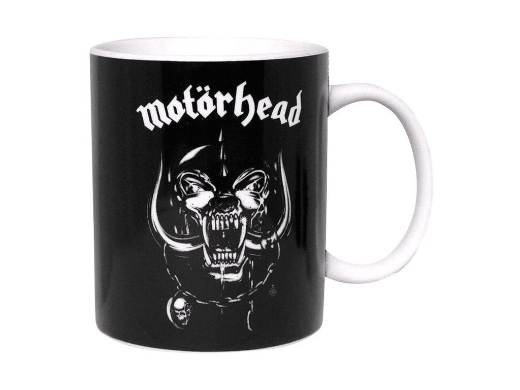 Bíl keramický hrnek s potiskem, vycházejícím z grafiky, inspirované grafikou a designem spojenými s anglickou heavymetalovou skupinou Motörhead.