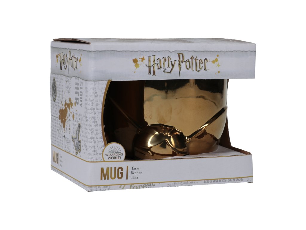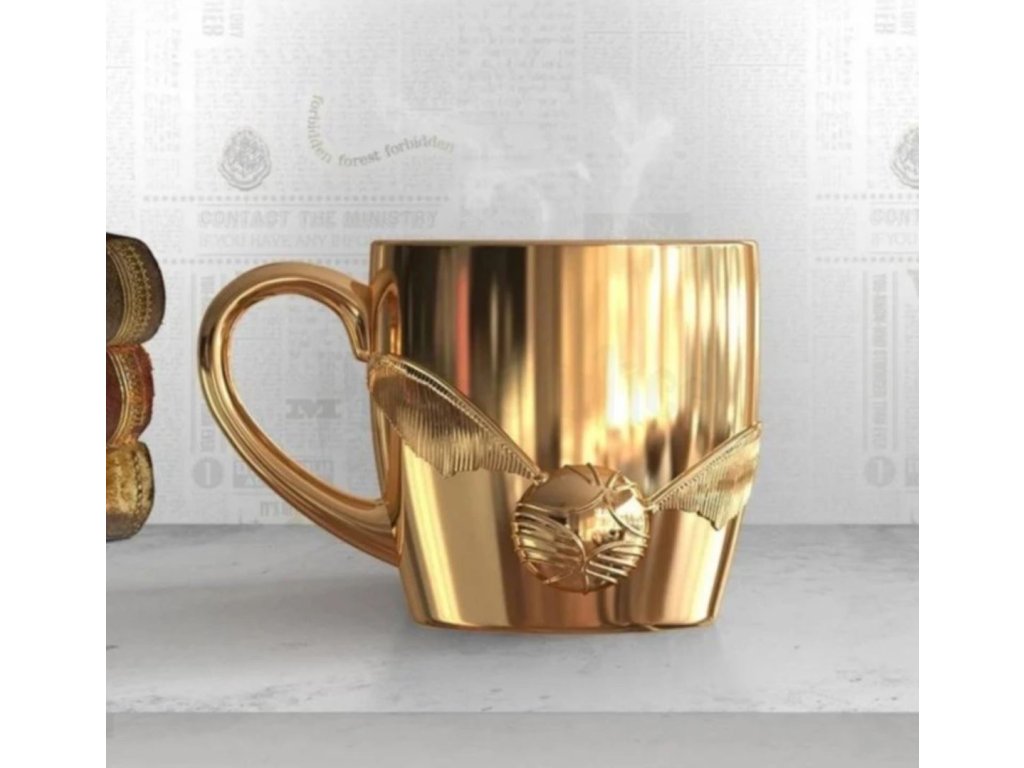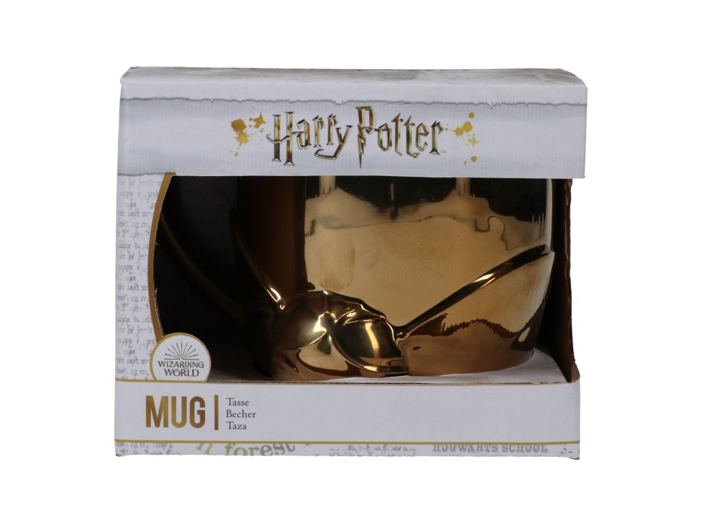 Atraktivní zlatý keramický glazovaný 3D hrnek s grafikou Zlatonky. Tímto designovým hrnkem rozhodně zaujmete své kolegy v práci, či známé nebo rodinu při návštěvě. Hrníček je velice zajímavý svým tvarem a barvou a je vhodný jako dárek pro každého malého i velkého fanouška této kouzelnické ságy.