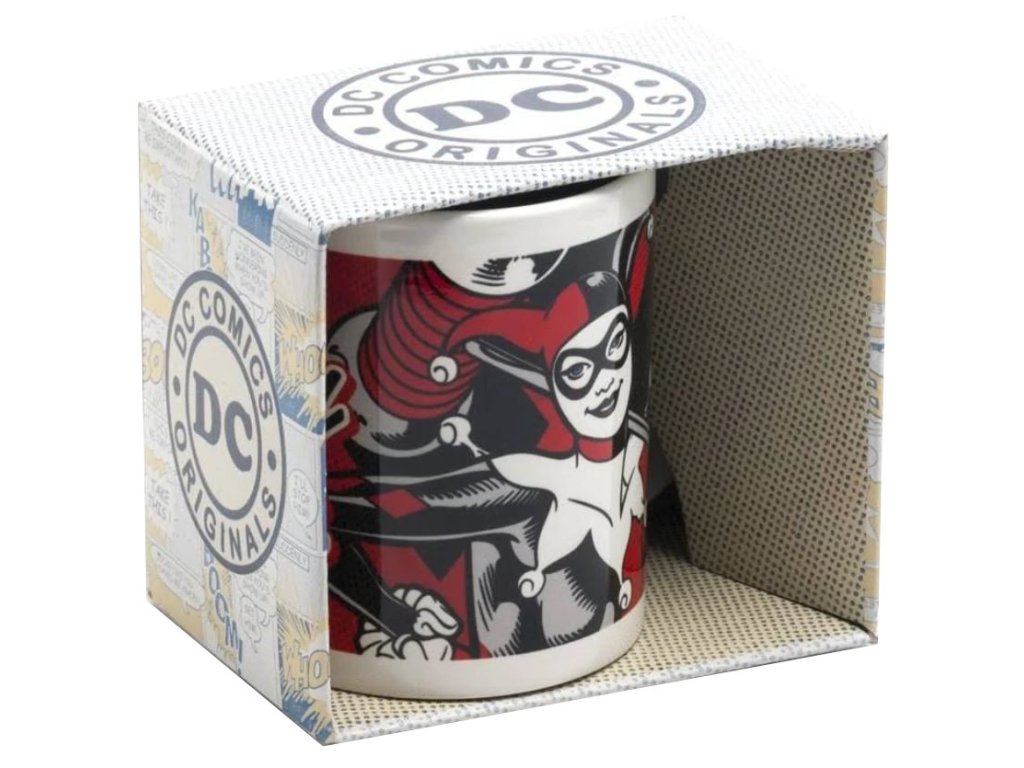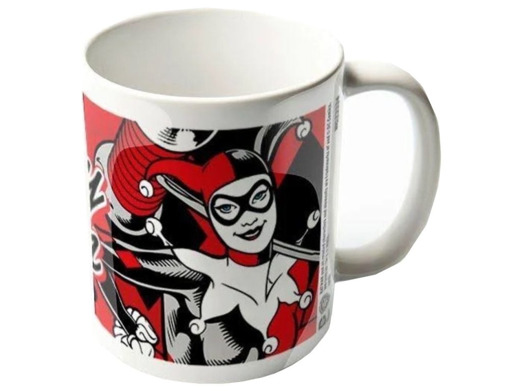 Oficiální hrnek z katalogu produktů s logem, fotografiemi a grafikou fiktivní postavy jménem Harley Quinn.