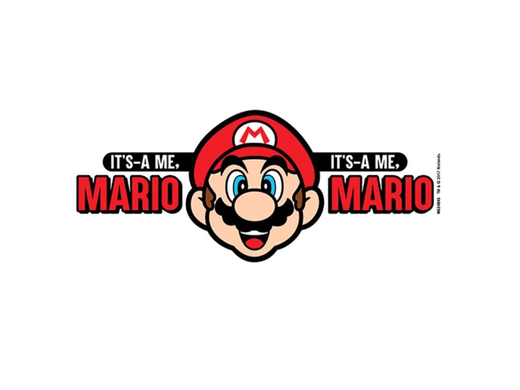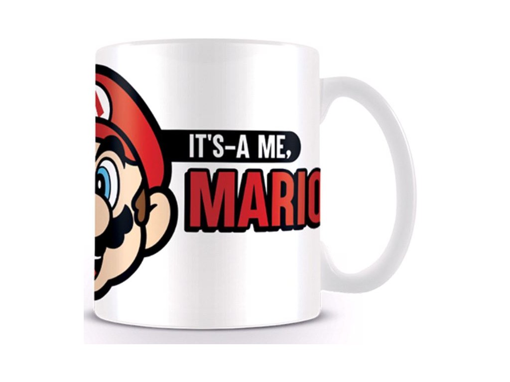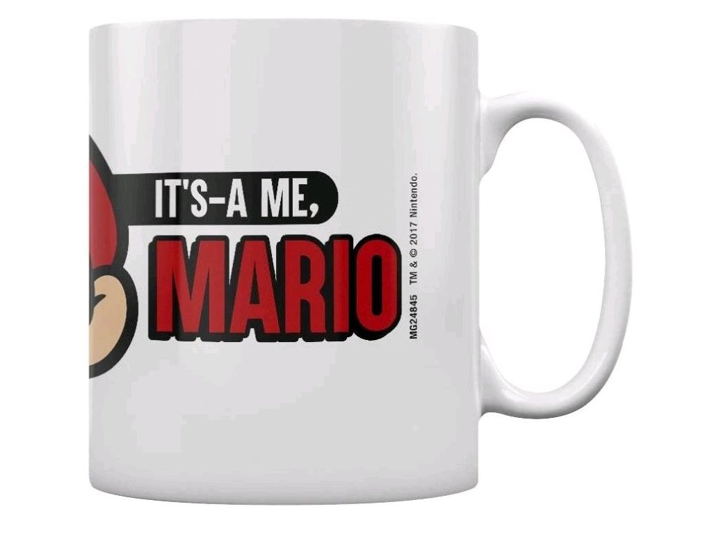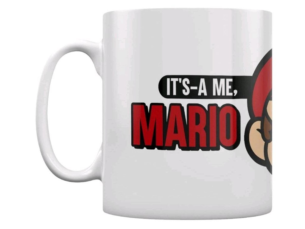 Bílý keramický hrnek s grafikou počitačové hry Super Mario a nápisem "Its a me Mario".