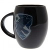 Černý, oválný glazovaný keramický hrnek s grafikou a logem Havraspárské uniformy.
