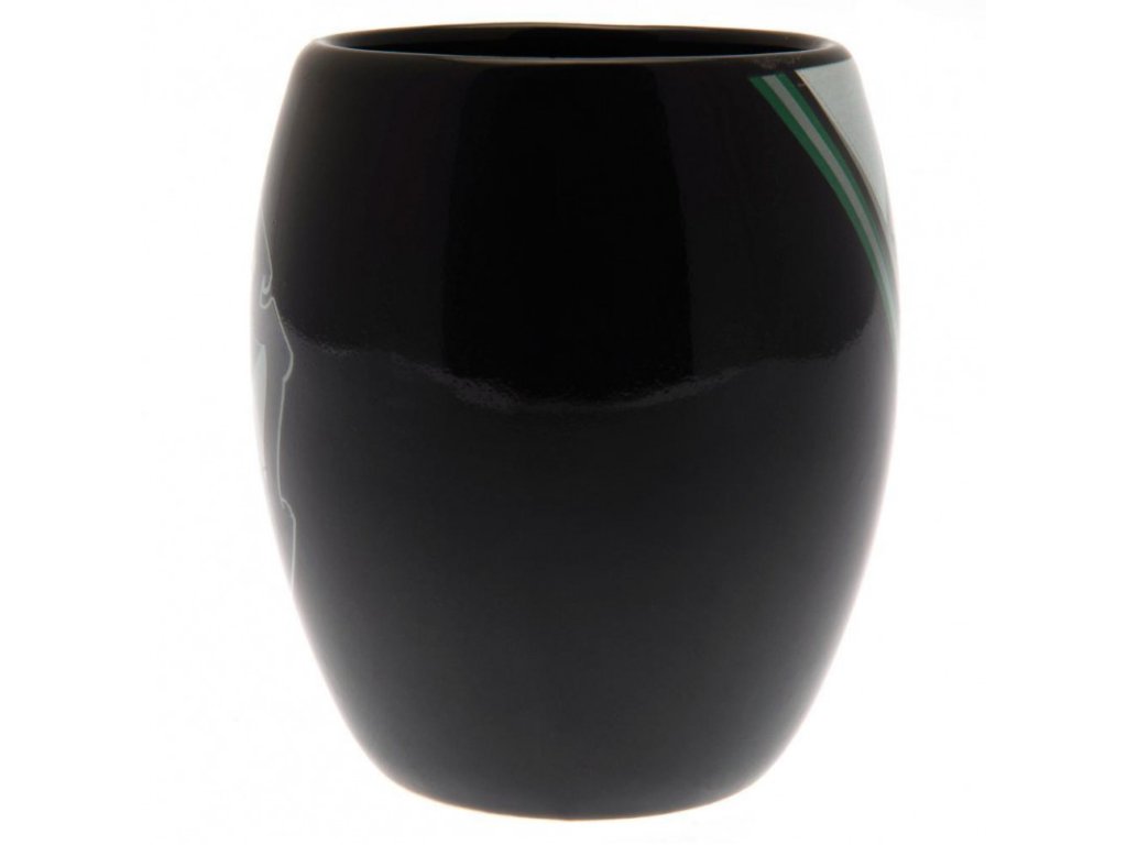 Černý, oválný glazovaný keramický hrnek s grafikou a logem Zmijozelské uniformy.