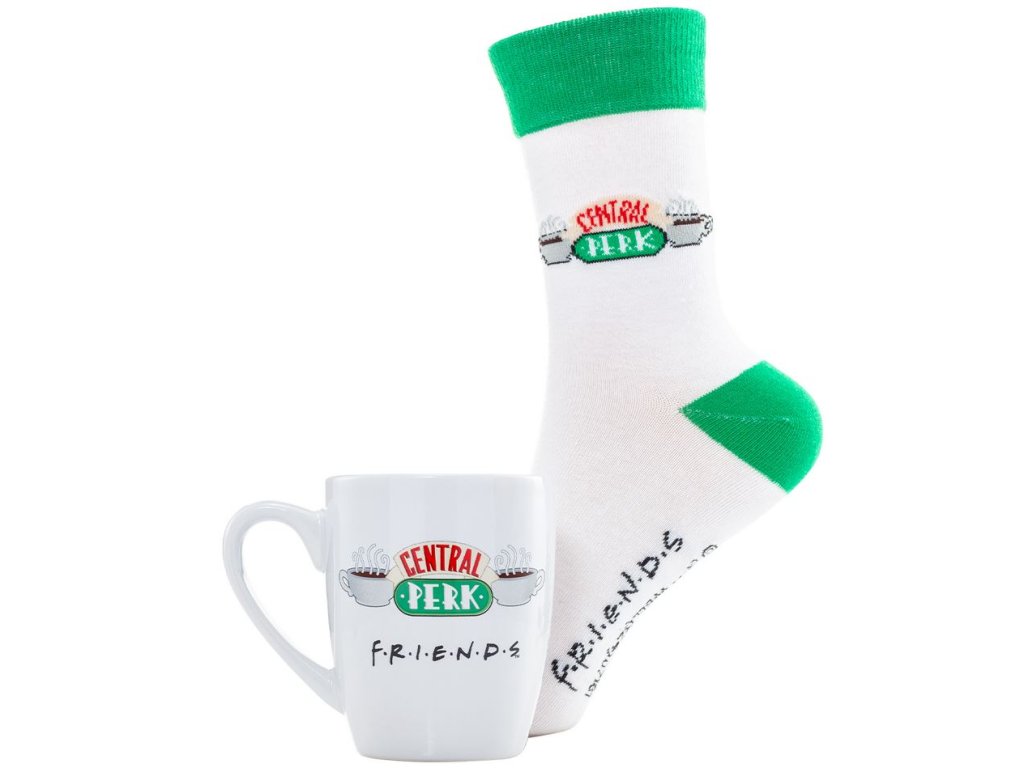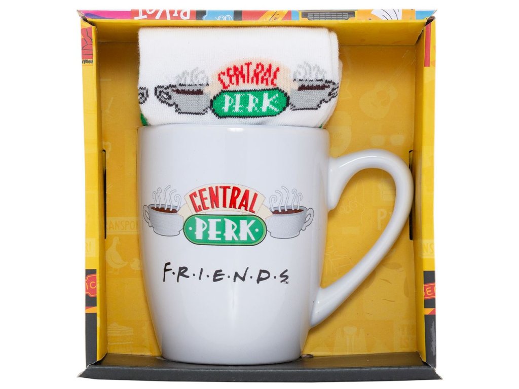 Dárkový set předmětů - hrnek s ponožkami, inspirovaný populární kavárnou Central Perk, kde se scházeli přátelé ze seriálu Friends. Set hrníčku a ponožek je dodávaný v dárkové krabičce se stejným motivem, a proto je celá sada vhodná jako dárek pro každého menšího i většího fanouška.