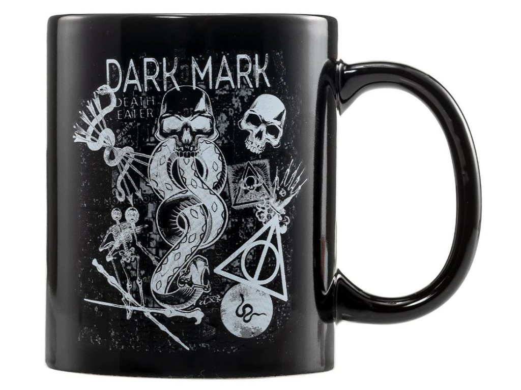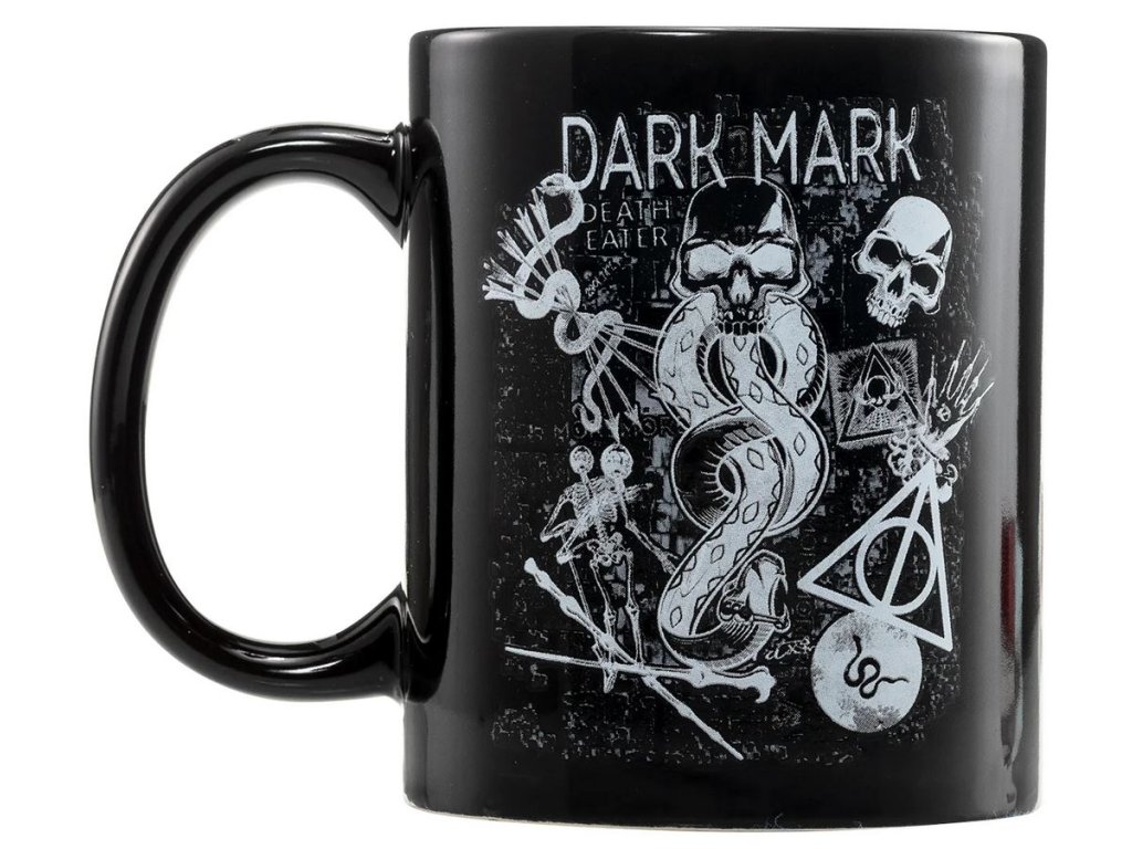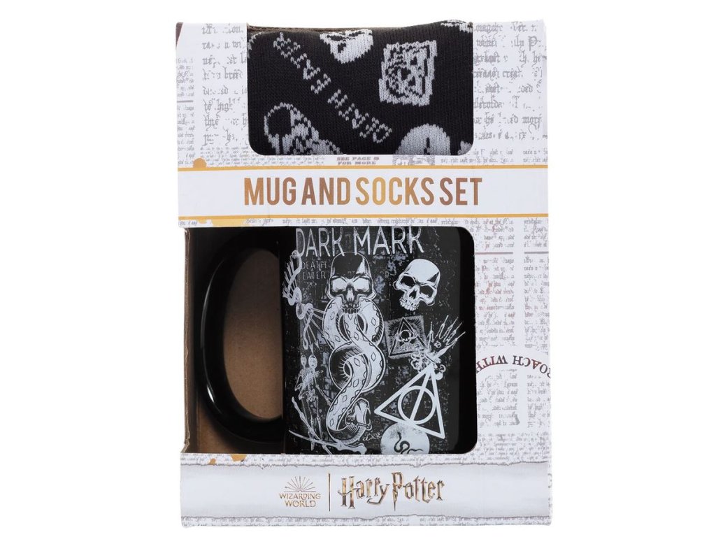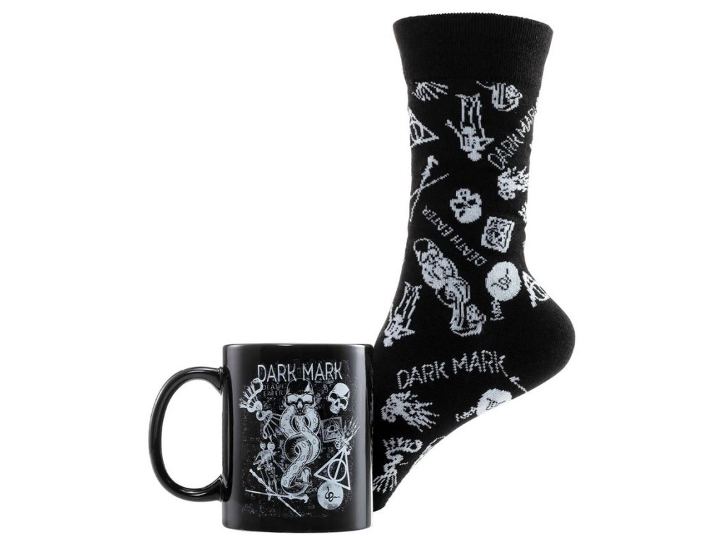 Dárkový set předmětů - hrnek s ponožkami, inspirovaný siluetami Mozkomorů a předmětů temného umění. Set hrníčku a ponožek je dodávaný v dárkové krabičce se stejným motivem, a proto je celá sada vhodná jako dárek pro každého menšího i většího fanouška Harryho Pottera.