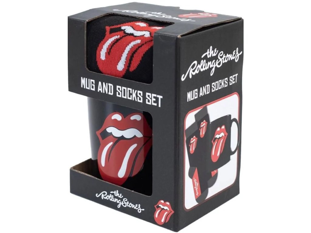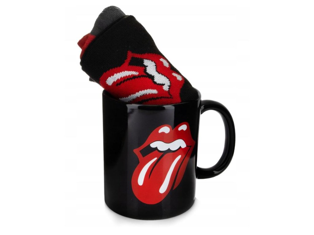 Dárkový set předmětů - hrnek s ponožkami, inspirovaný logem jazyka hudební kapely The Rolling Stones. Set hrníčku a ponožek je dodávaný v dárkové krabičce se stejným motivem, a proto je celá sada vhodná jako dárek pro každého menšího i většího hudebního fanouška.