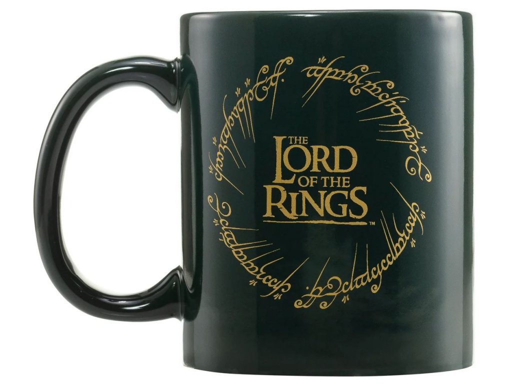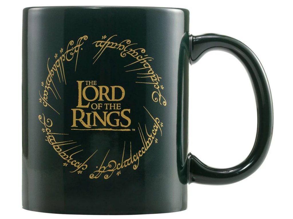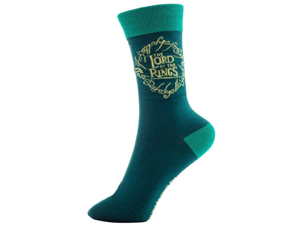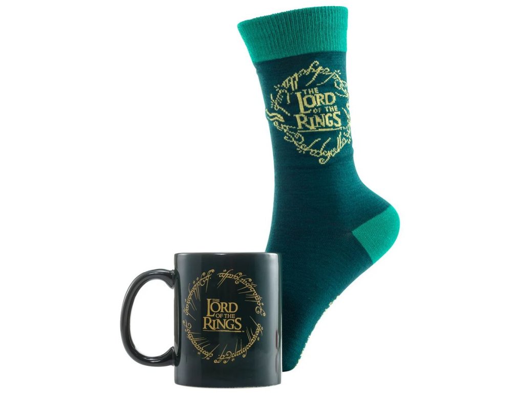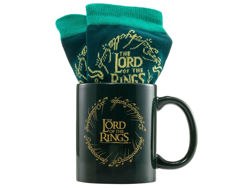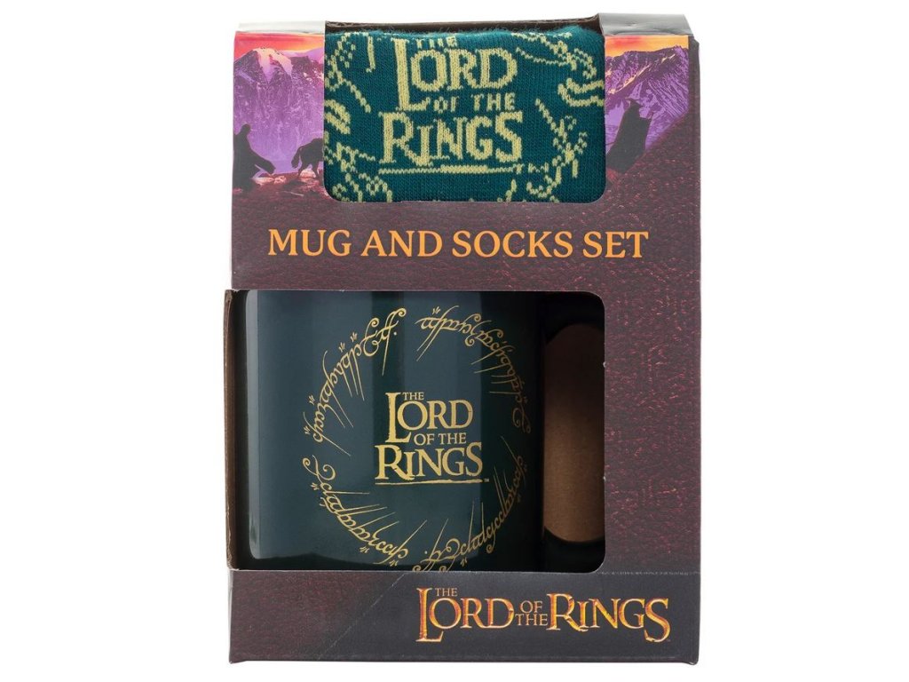 Dárkový set předmětů - tmavě zelený hrnek s ponožkami s grafikou loga filmové ságy Pán prstenů. Set hrníčku a ponožek je dodávaný v dárkové krabičce se stejným motivem, a proto je celá sada vhodná jako dárek pro každého menšího i většího fanouška.