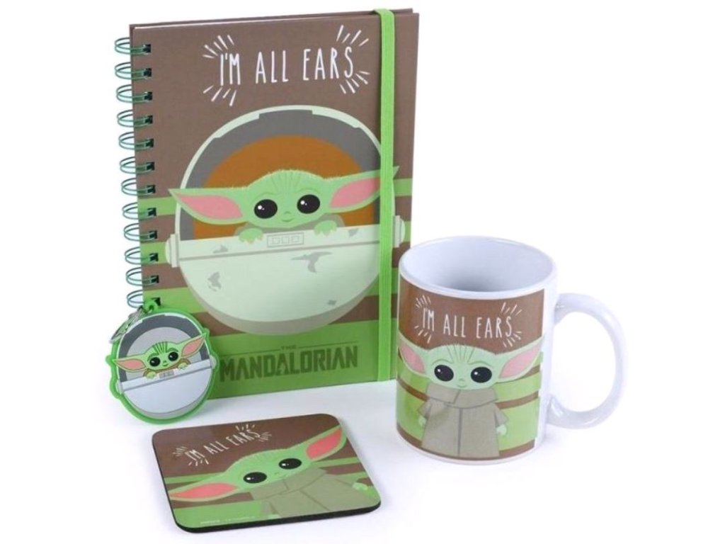 Dárkový set s motivy, znaky a grafikou amerického space western seriálu The Mandalorian. Set obsauje: hrnek, podtácek, blok a klíčenku s motivem Baby Yody a blok v kroužkové vazbě.