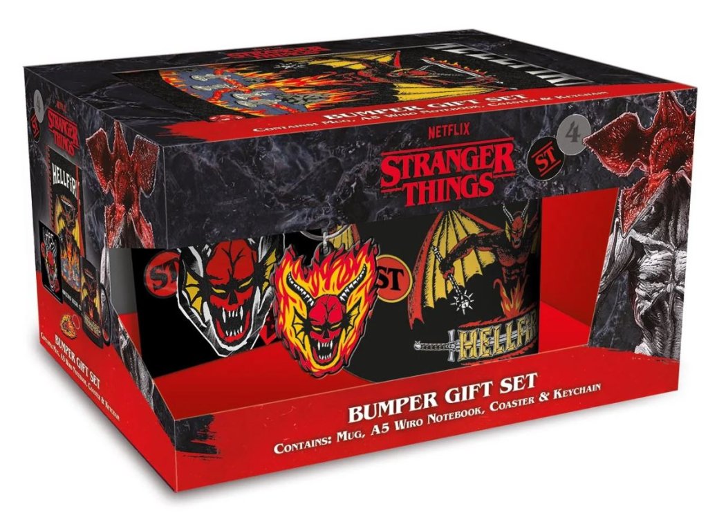 Dárkový set 4 předmětů, inspirovaný populárním seriálem Stranger Things je provedený s grafikou Hellfire Klubu. Set hrníčku, podtácku, klíčenky a bloku je dodávaný v dárkové krabičce se stejným motivem, a proto je celá sada vhodná jako dárek pro každého menšího i většího fanouška.