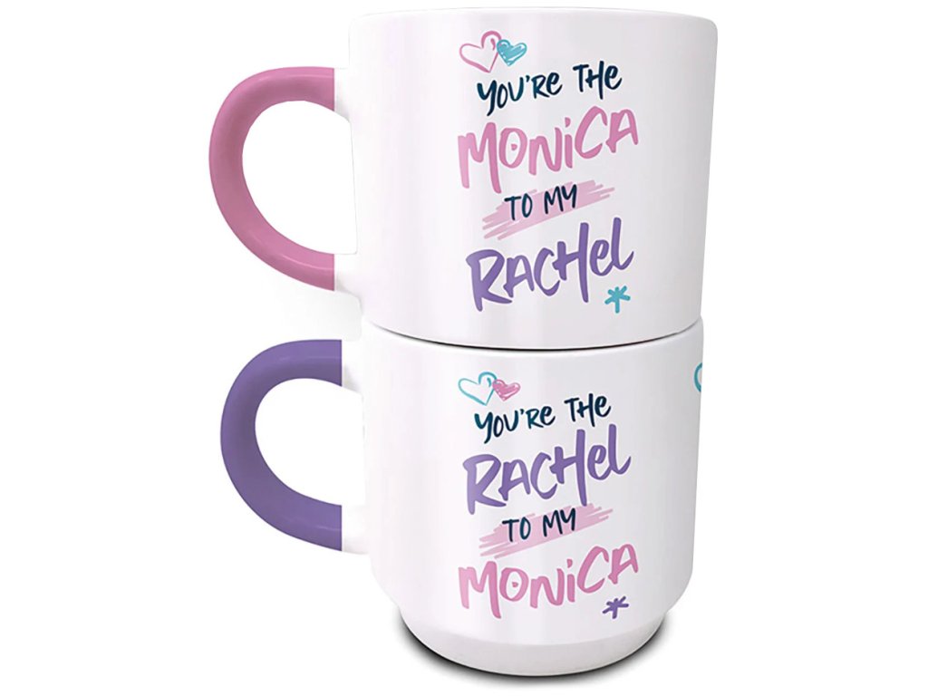 Set dvou kusů bílých keramických hrníčků s motivem a jmény Monicy and Rachel z populárního seriálu Friends (Přátelé).