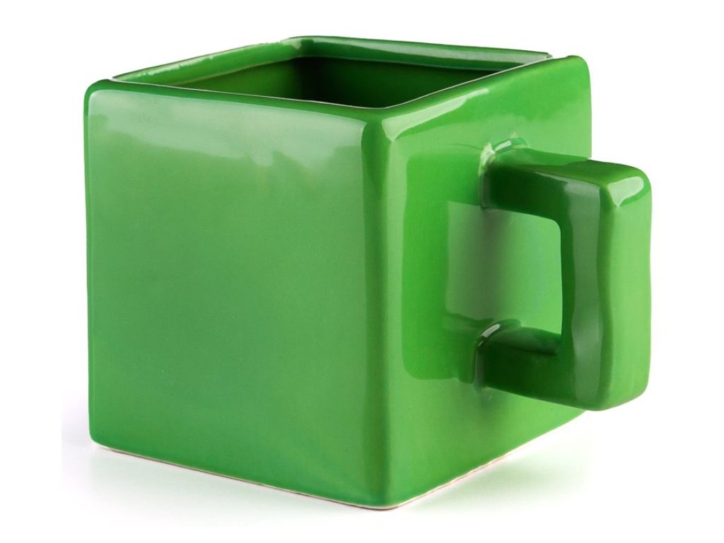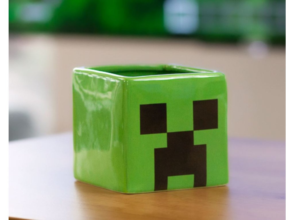 Zelený hrnek inspirovaný postavou Creeper ze hry Minecraft.