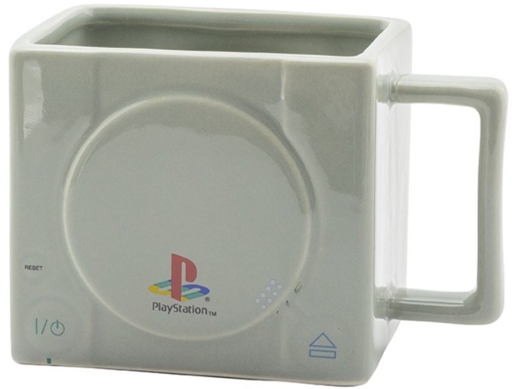 Šedý keramický hrnek ve tvaru kostky, je vzpomínka na první PlayStation konzoli, která vyšla roku 1994. Na dvou stranách se nachazí přesná replika console i s jejími tlačítky jako je reset, tlačítko vypnutí a zapnutí a také napodobenina prostoru pro vložení hry.