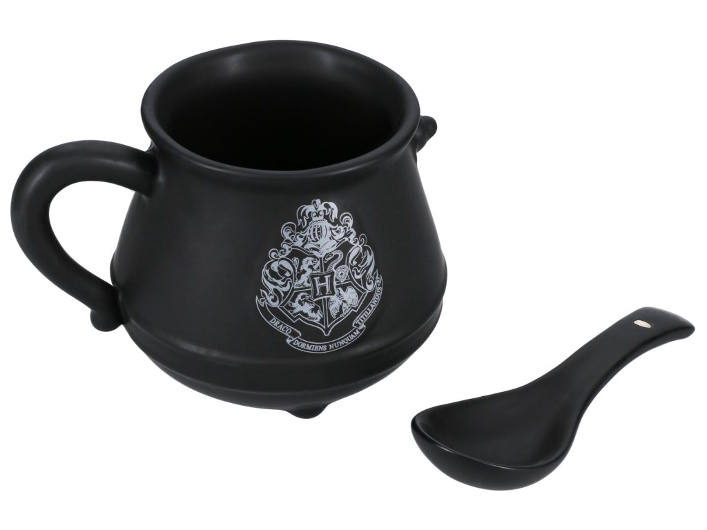 3D keramický hrnek ve tvaru kotlíku s lžičkou s motivem znaku Školy čar a kouzel.