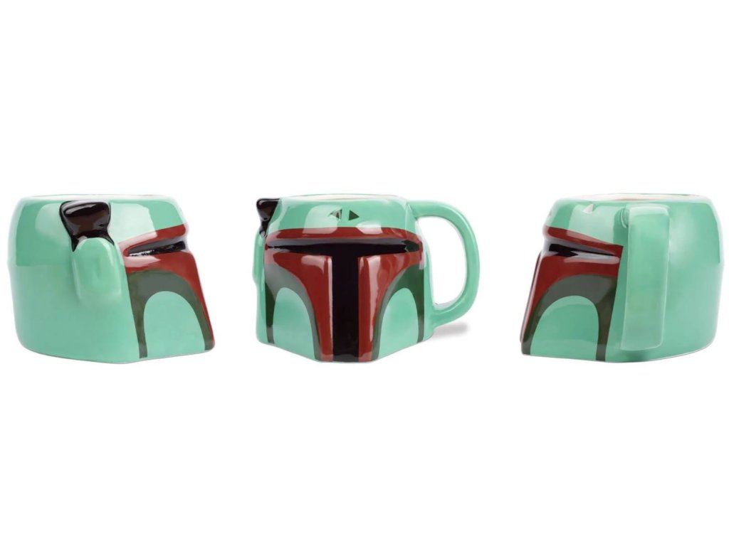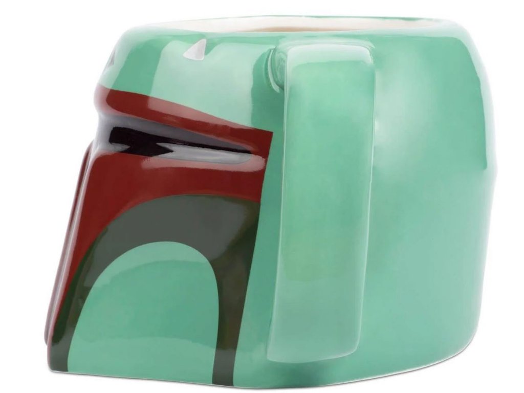 Zelený keramický hrnek vyvydený ve tvaru masky nájemného lovce Boba Fetta.