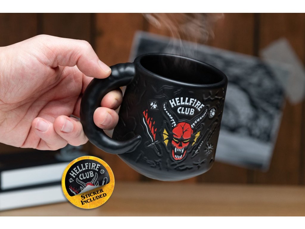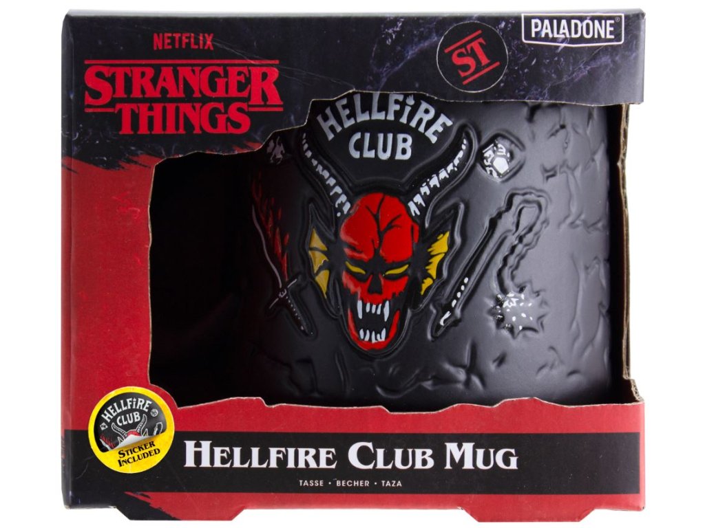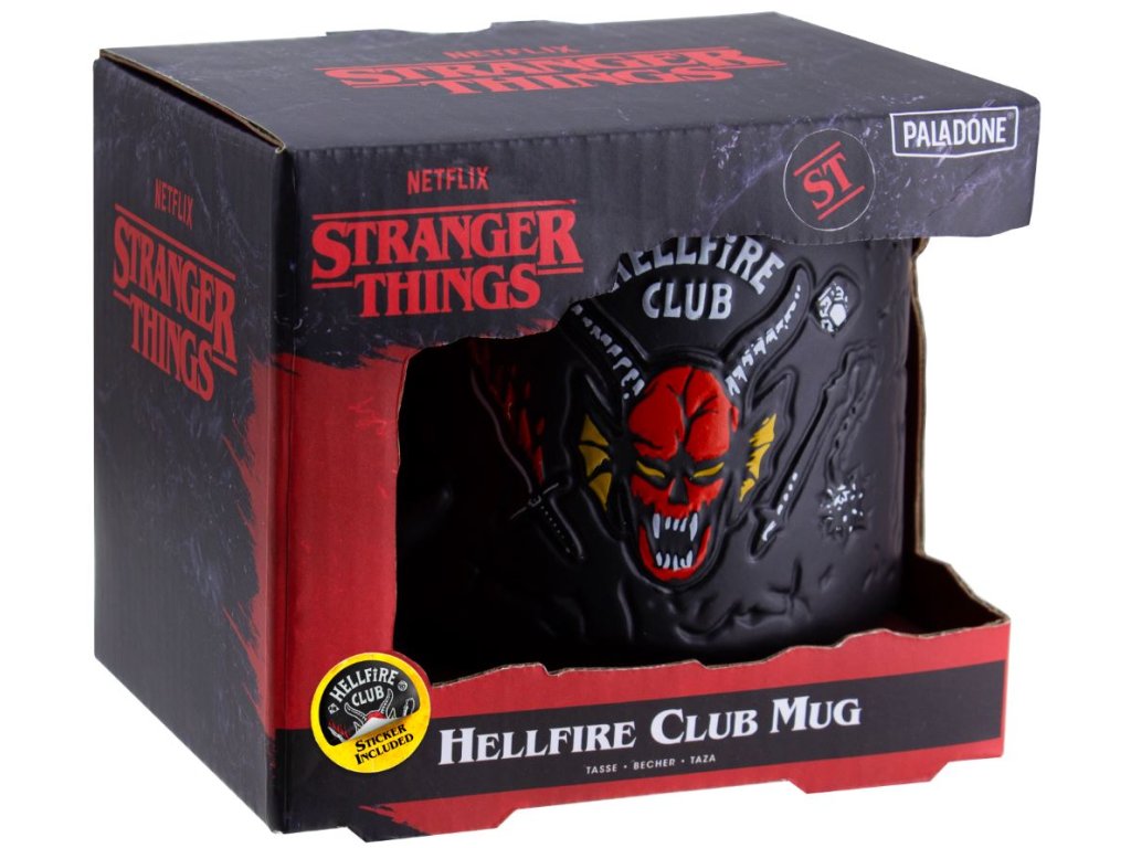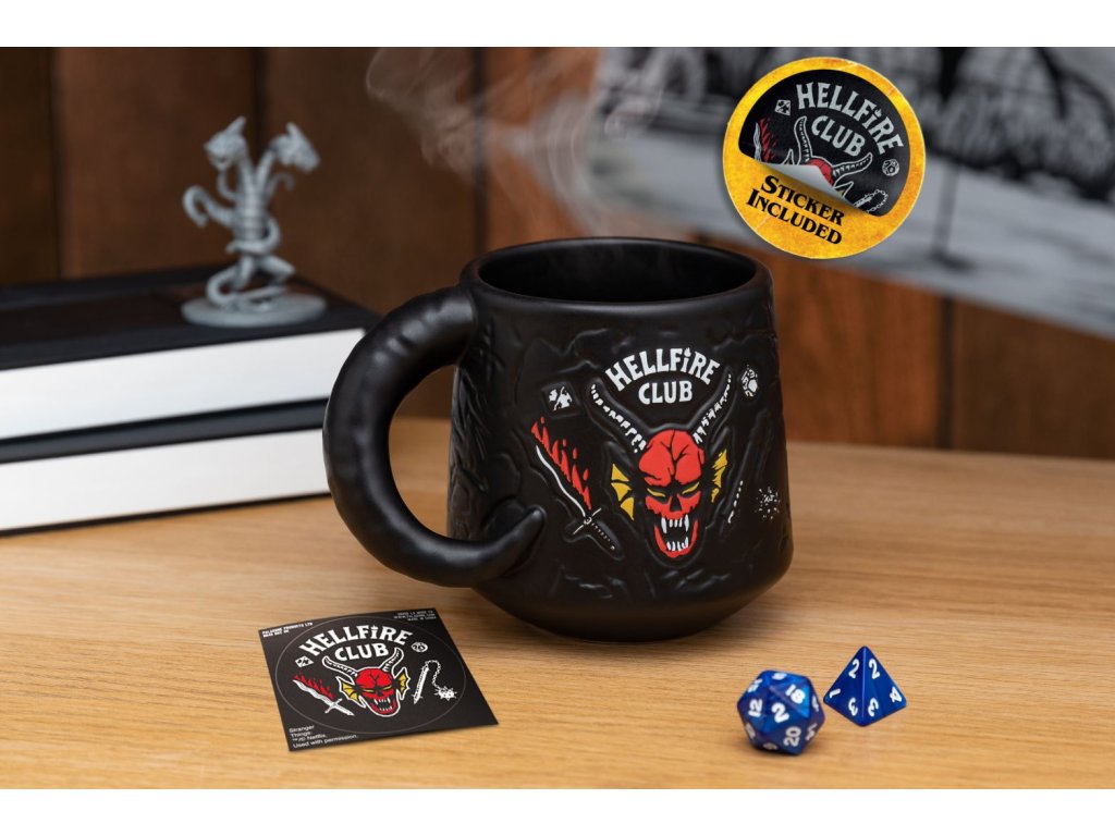 Černý keramický hrnek s grafikou populárního Hellfire Demon z amerického seriálu Stranger Things od společnosti Netflix. Hrníček je vhodný do myčky na nádobí, měří 9,5 cm na výšku 8 cm v průměru a je dodáváný v ochranném obalu.