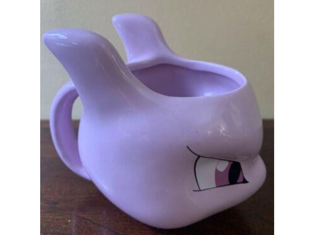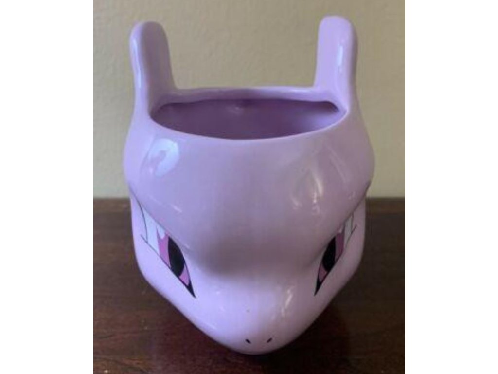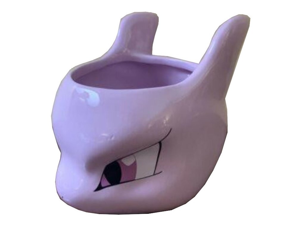 3D keramický hrnek vyvedený v grafice hlavy uměle vytvořeného pokémona MewTwo.