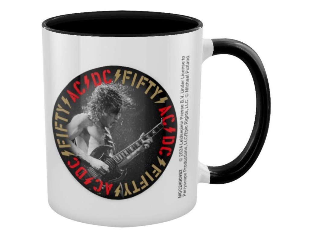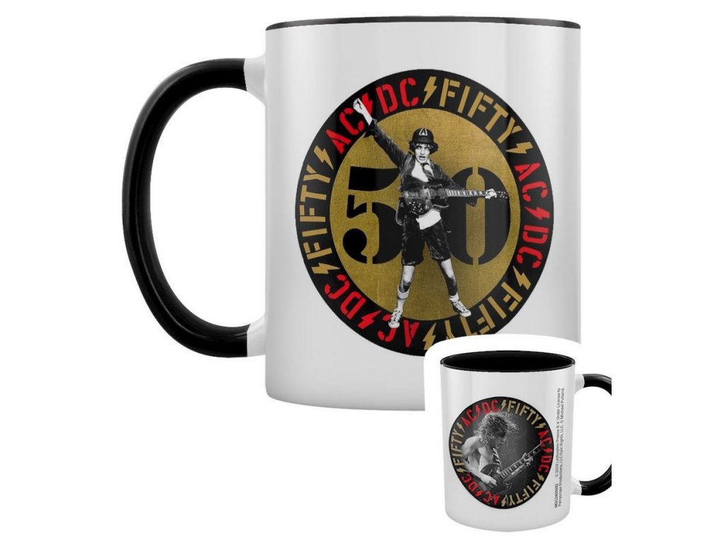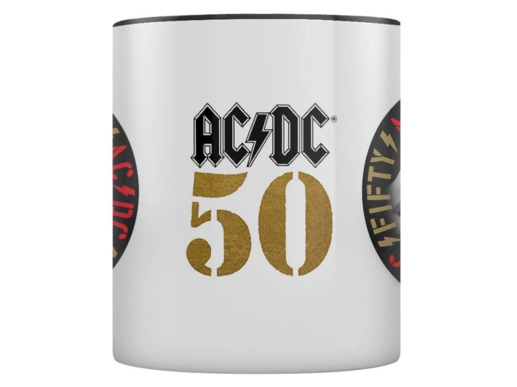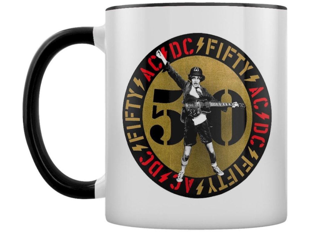 Černý keramický glazovaný hrnek s bílým potiskem a logem k 50. výročí slavné rockové hudební skupiny AC/DC. Hrnek je vhodným dárkem pro všechny hudební fanoušky.
