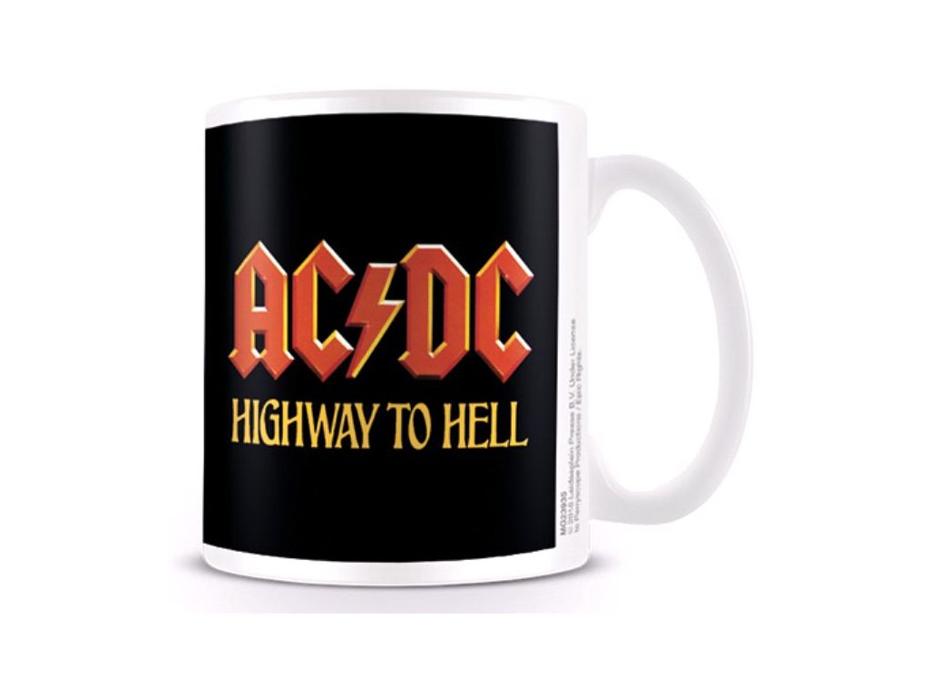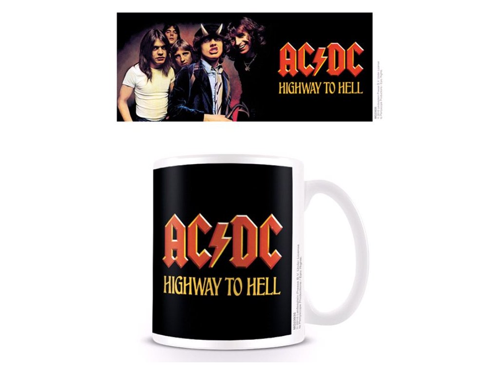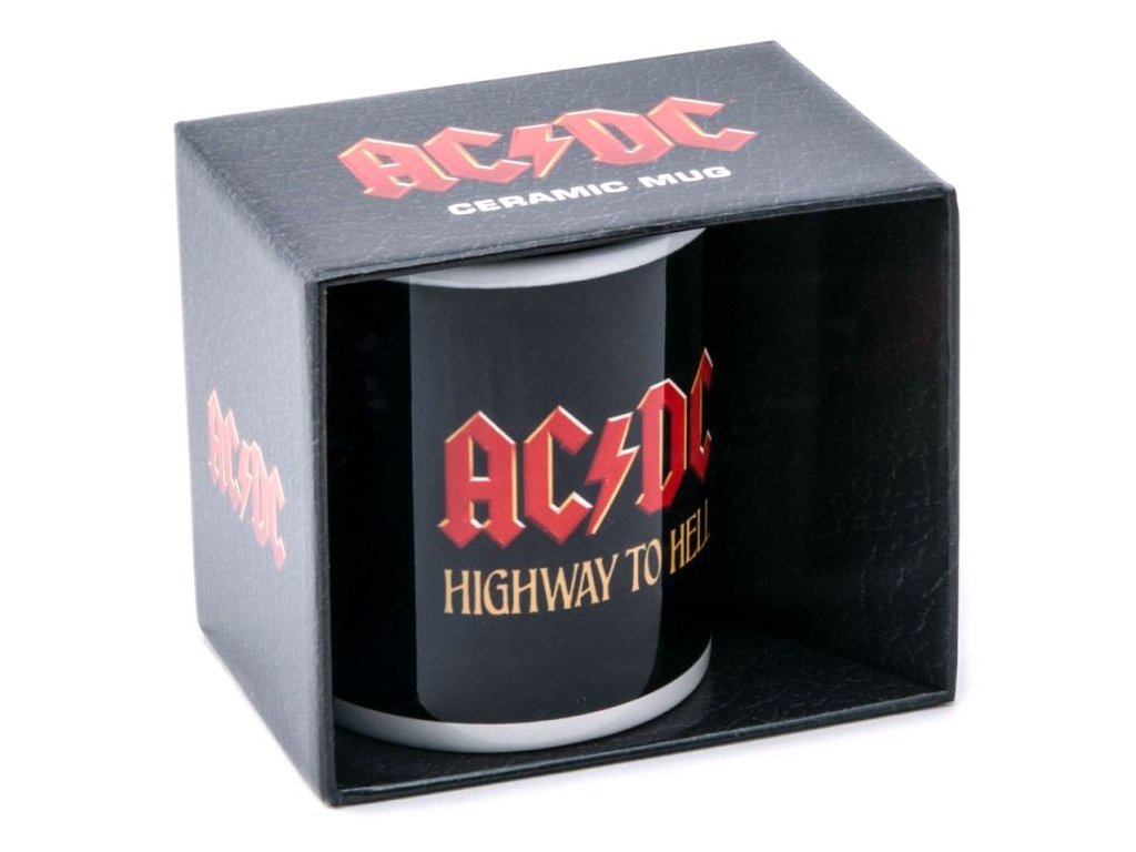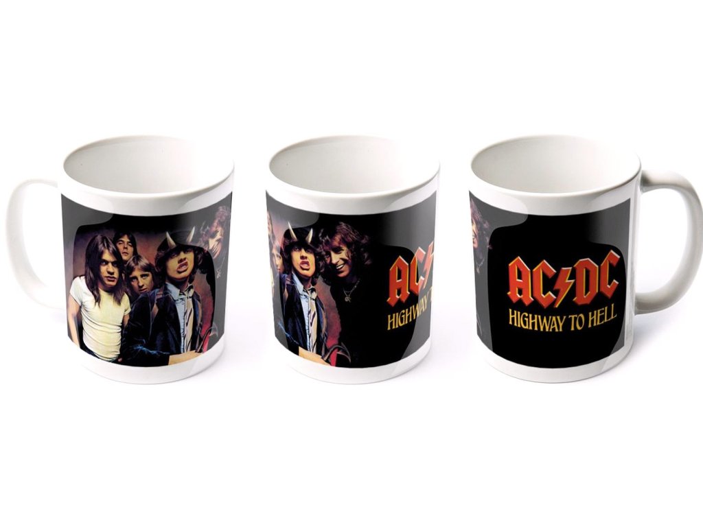 Bílý glazovaný keramický hrnek s logem skupiny AC/DC a grafikou jejich šestého studiového alba Highway to Hell.