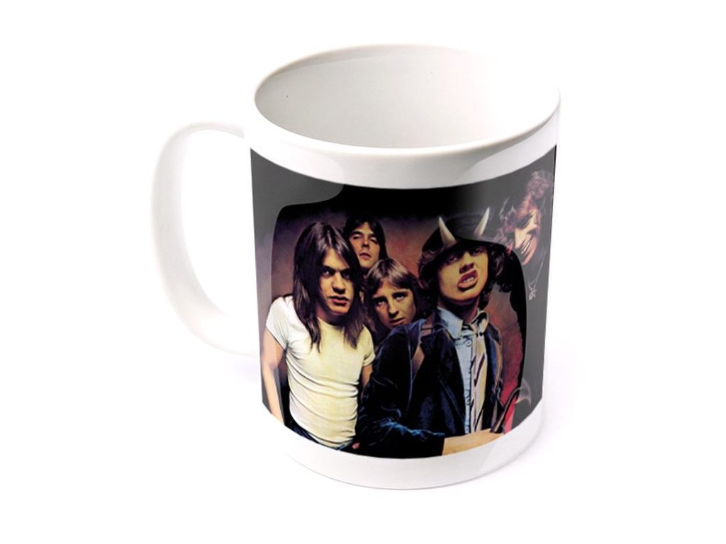 Oficiální hrnek a doplňkové zboží z katalogu produktů s logem, grafikou a fotografiemi australské hardrockové skupiny AC/DC
