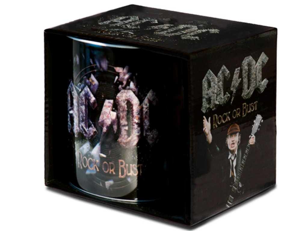 Oficiální hrnek a doplňkové zboží z katalogu produktů s logem, fotografiemi a grafikou australské hard-rockové skupiny AC/DC.