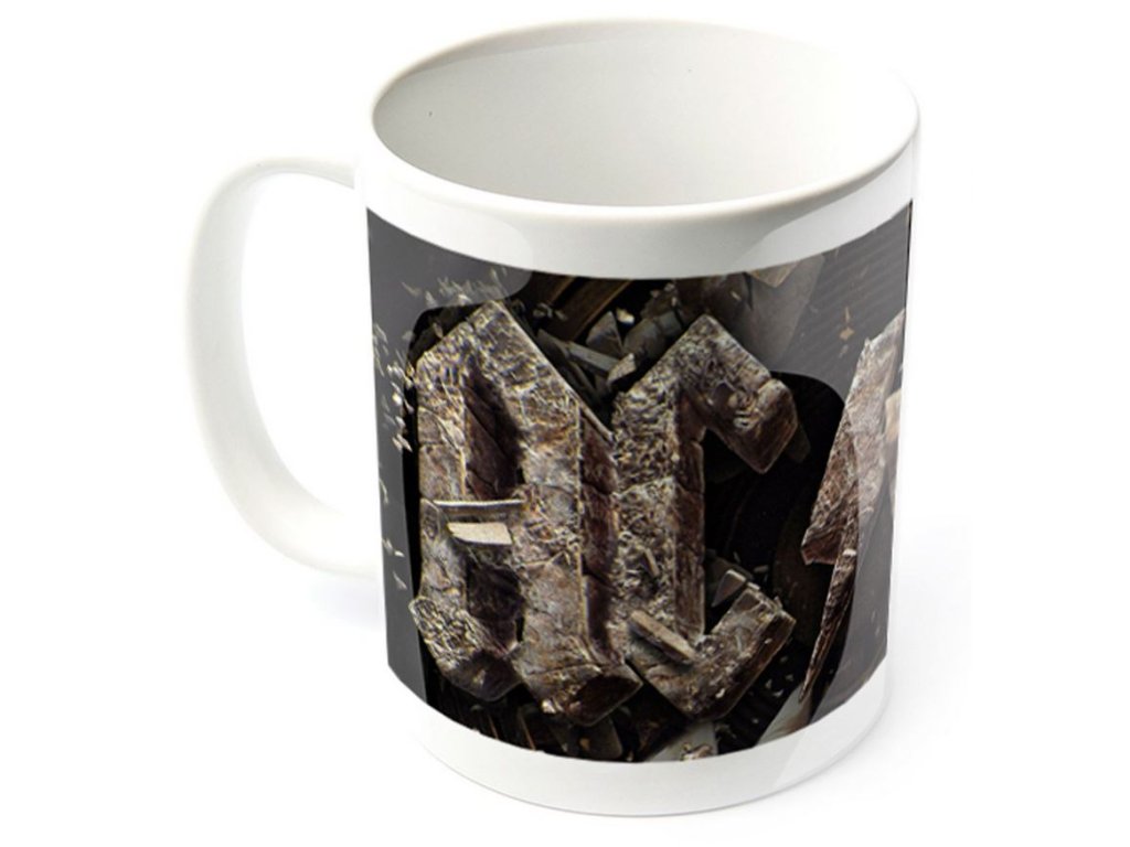 Bílý glazovaný keramický hrnek s logem skupiny AC/DC a grafikou jejich patnáctého studiového alba Rock or Bust.