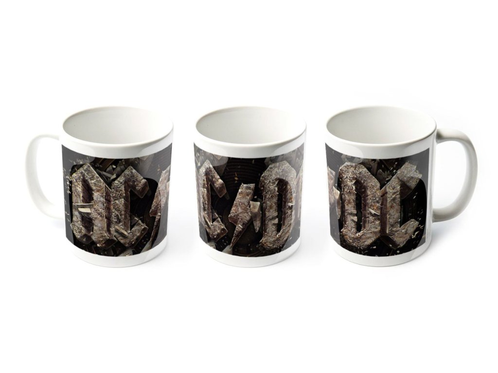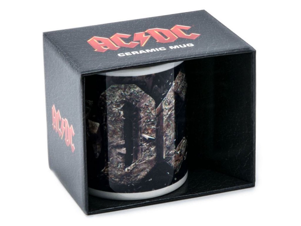 Oficiální hrnek a doplňkové zboží z katalogu produktů s logem, grafikou a fotografiemi australské hardrockové skupiny AC/DC