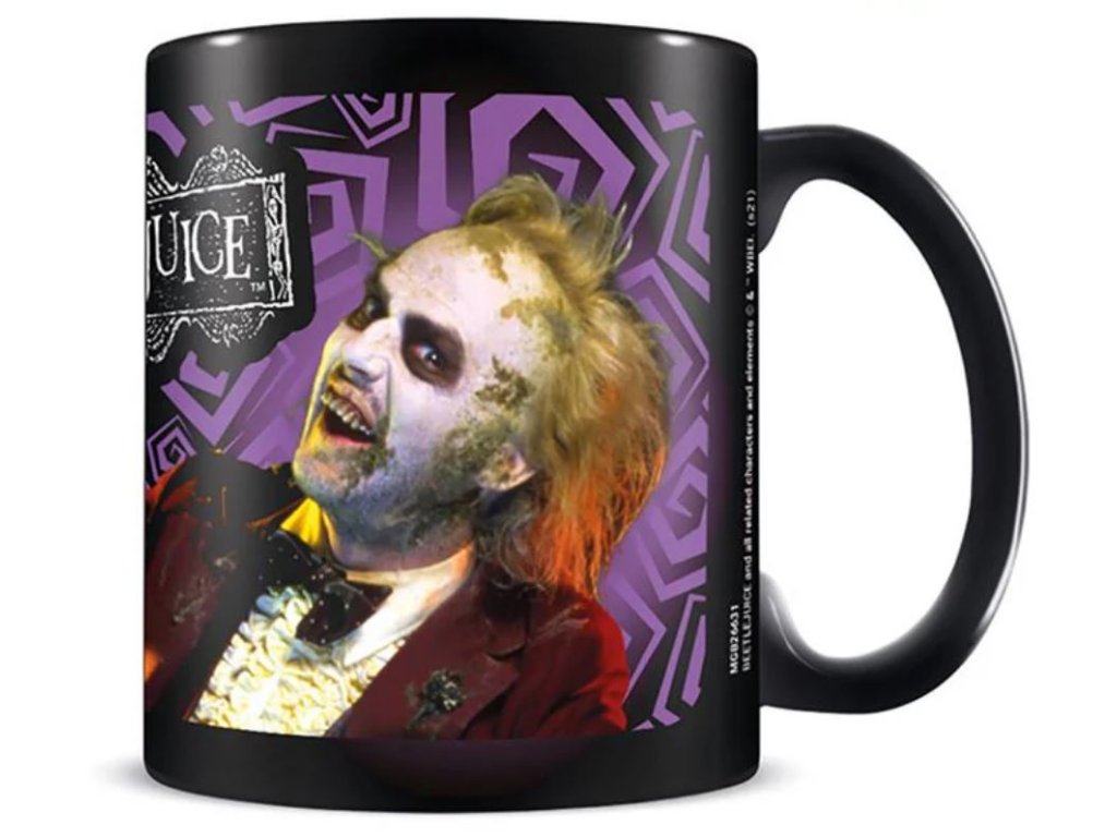 Oficiální produkt - keramický hrnek a doplňkové zboží z katalogu výrobků s logem, grafikou a fotografiemi z nového filmu Beetlejuice z roku 2024.
