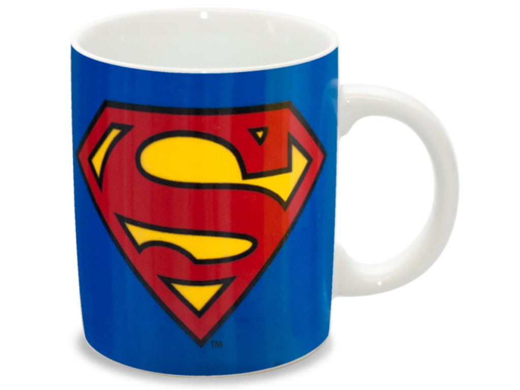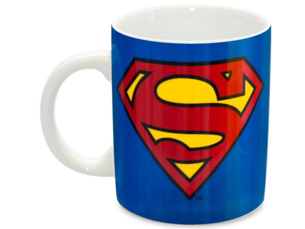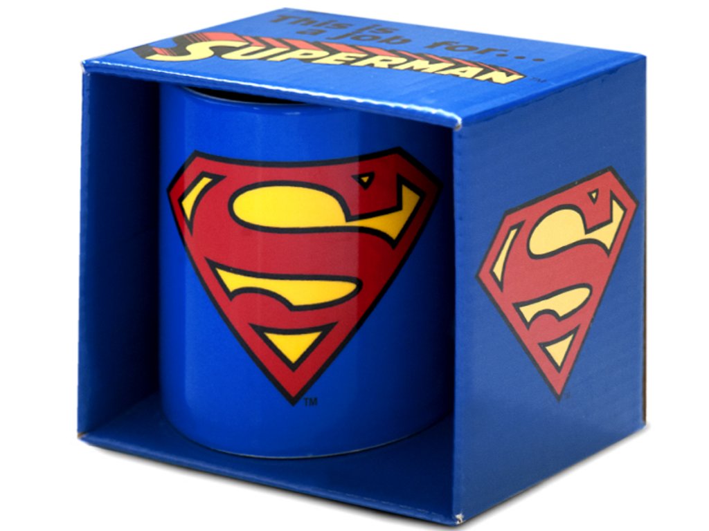 Oficiální hrnek a doplňkové zboží z katalogu produktů s logem a grafikou komiksového hrdiny Supermana a společnosti Warner Bros.