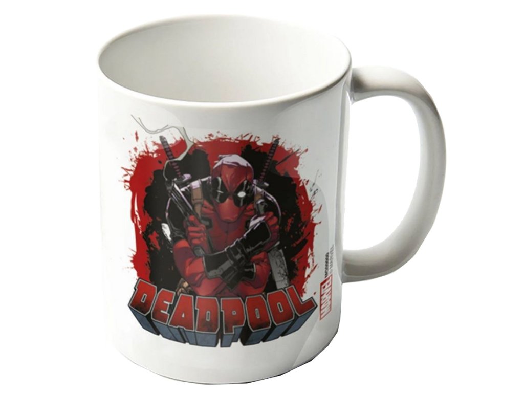 Bílý keramický hrnek s grafikou komiksového hrdiny Deadpoola.