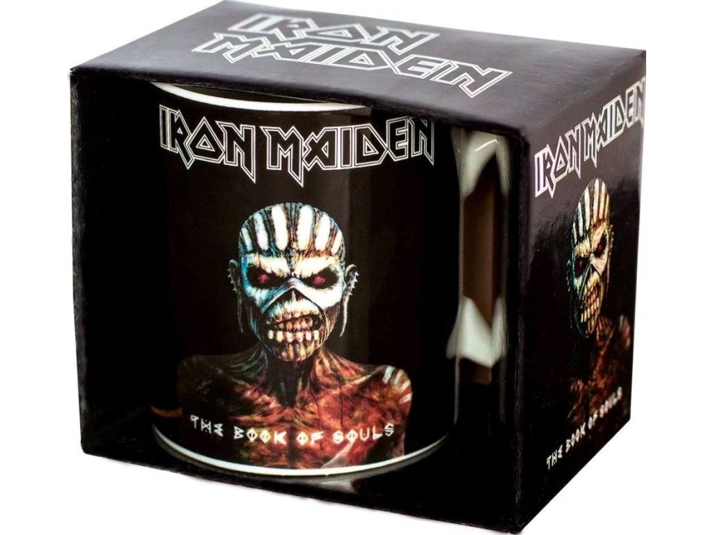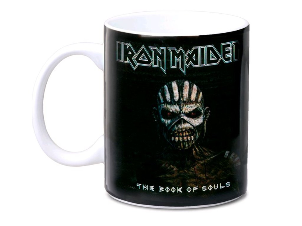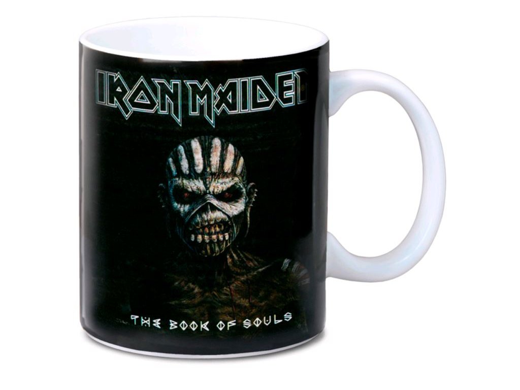 Bílý keramický hrnek s logem skupiny Iron Maiden a grafikou jejich šestnáctého studiového alba The Book of Souls.