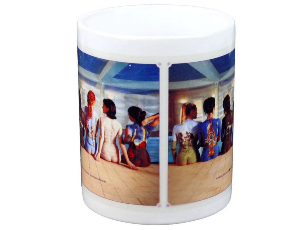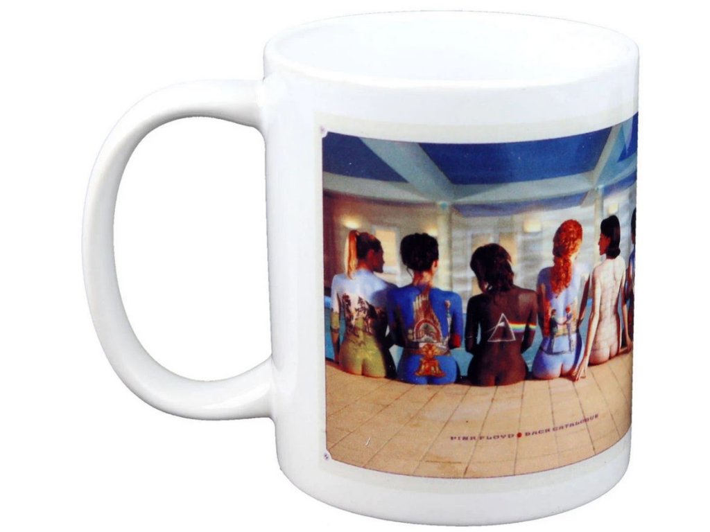 Bílý, keramický glazovaný hrnek s barevným potiskem šestice ženy, které mají na zádech graficky ztvárněné obaly alb slavné britské hudební skupiny Pink Floyd.