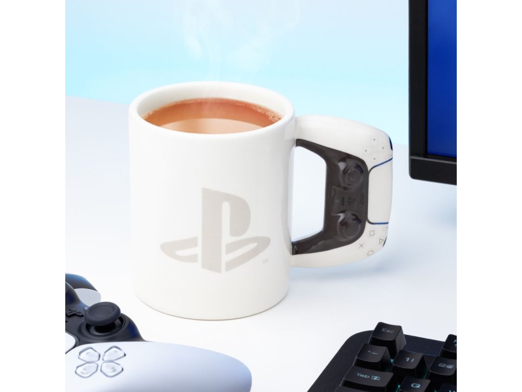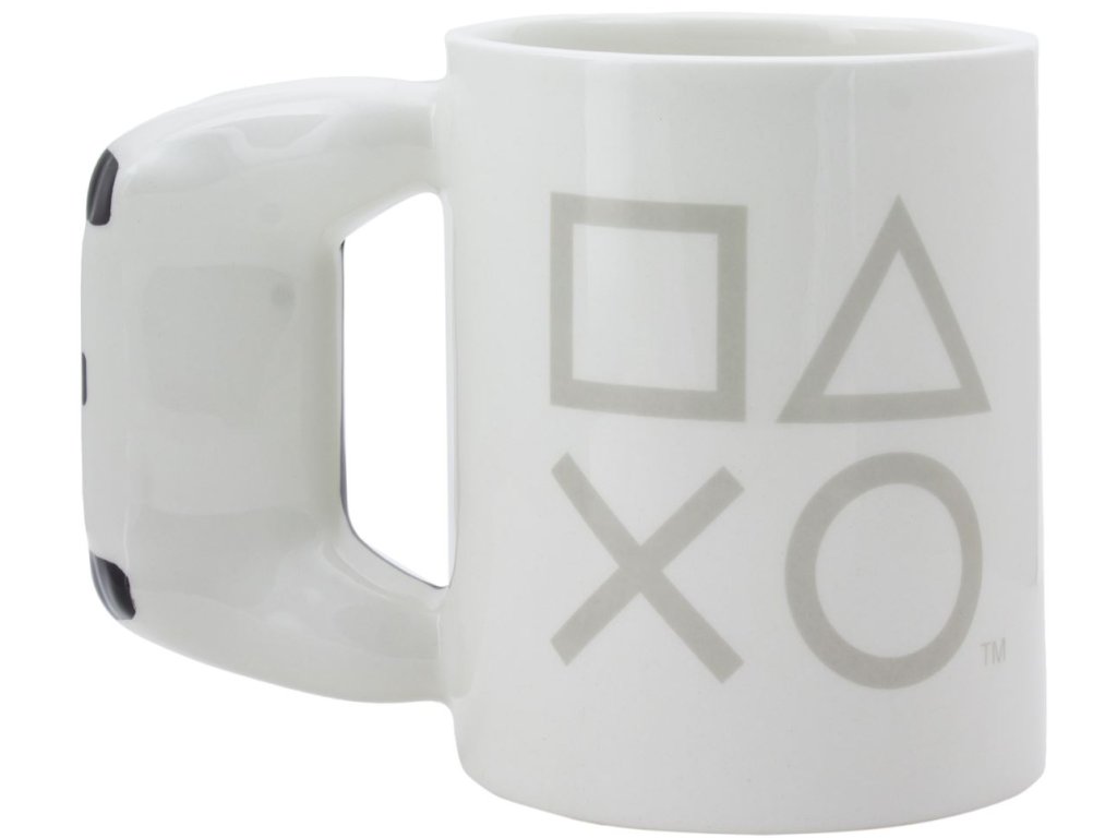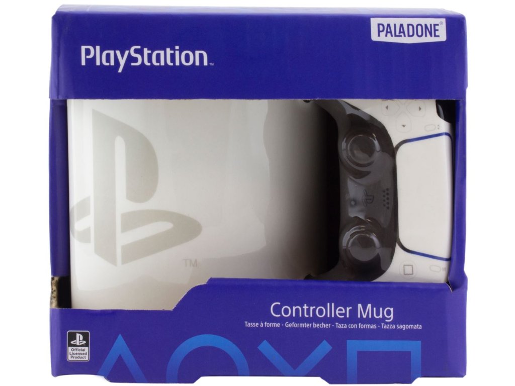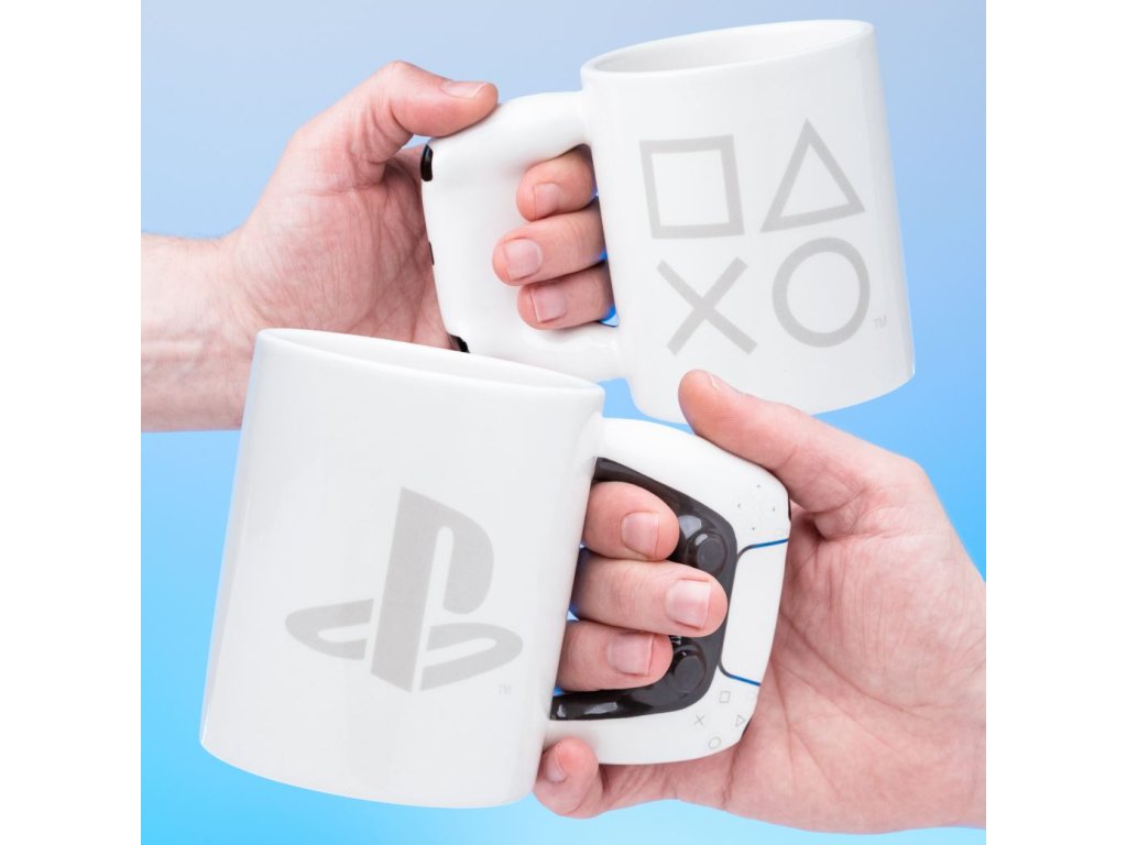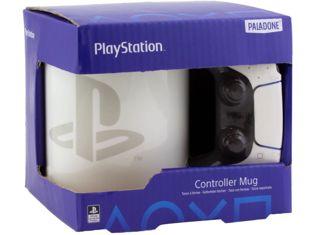 Bílý keramický hrnek v grafice Playstation. Na přední straně hrnku se nachází logo hraci konzole Playstation. Ucho hrnku je ve tvaru ovladače Playstation i s typickými tlačítky jako na opravdovém ovladači. Hrnek je balený v papírové krabičce.