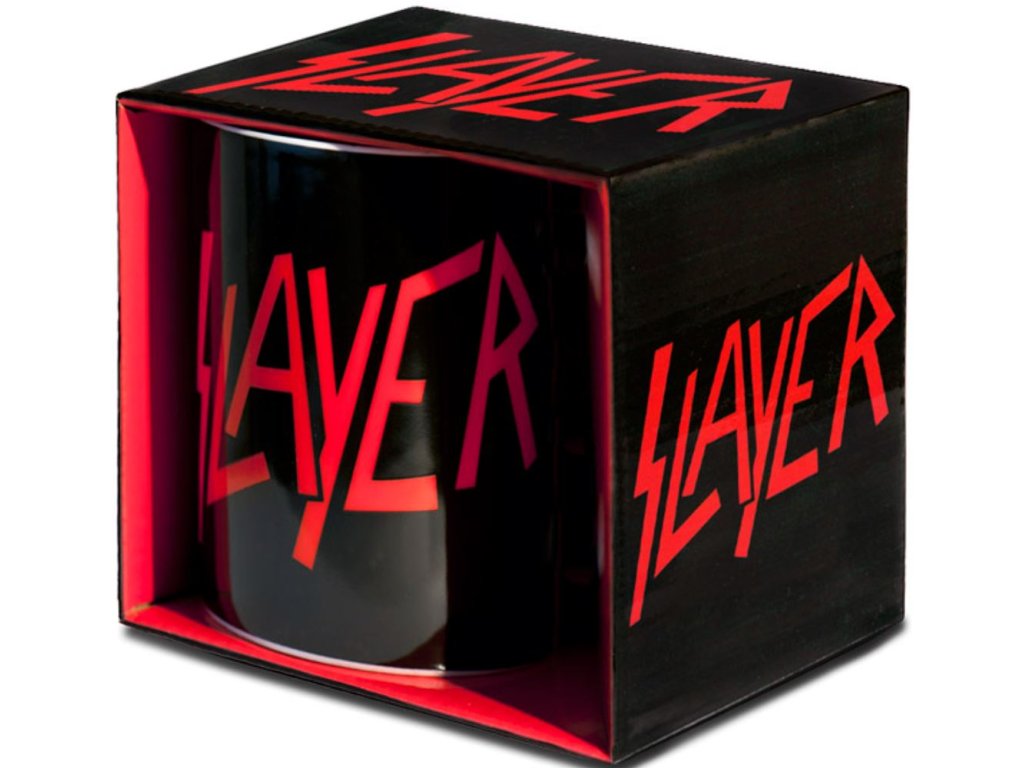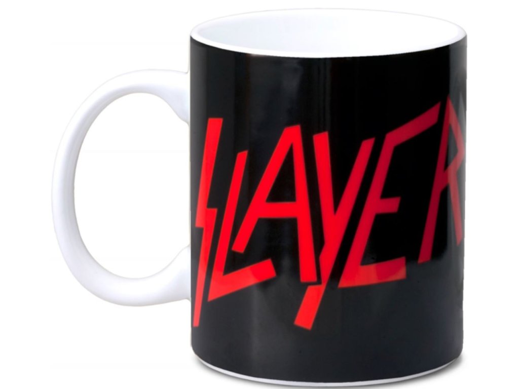 Oficiální hrnek a doplňkové zboží z katalogu produktů s logem, fotografiemi a grafikou slavné americké trashmetalové hudební skupiny Slayer.