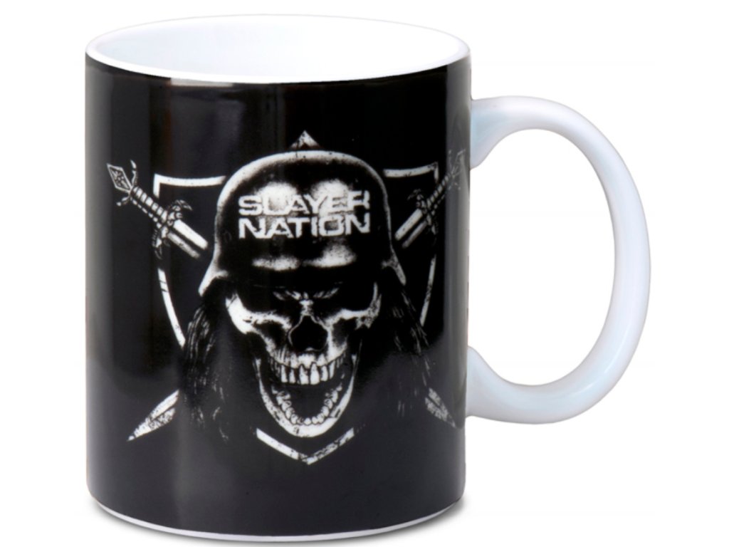 Oficiální hrnek a doplňkové zboží z katalogu produktů s logem, fotografiemi a grafikou slavné americké trashmetalové hudební skupiny Slayer.