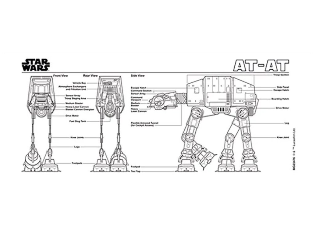 Bílý keramický hrnek s grafickým náčrtem robůtka At At ze slavné filmové ságy Star Wars. Hrnek je vhodný pro všechny menší i větší fanoušky.