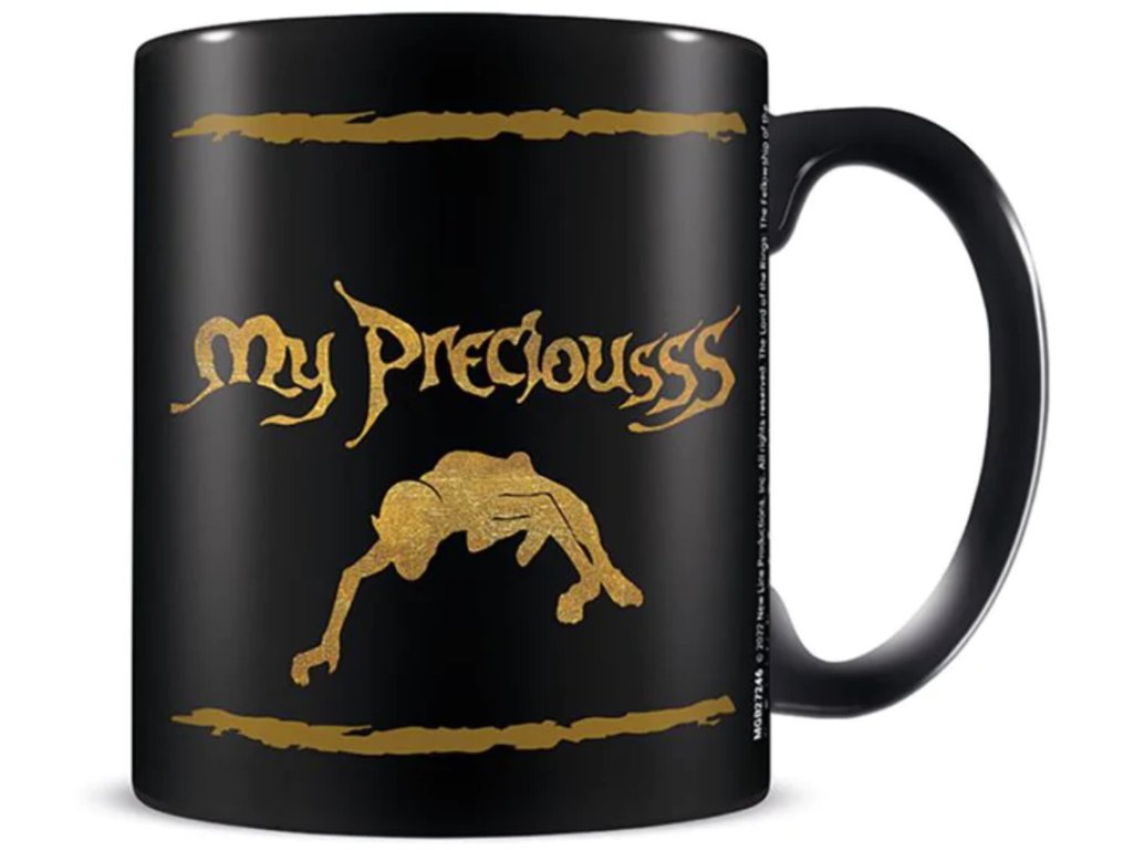 Černý keramický hrnek s grafickým potiskem My Preciousss.