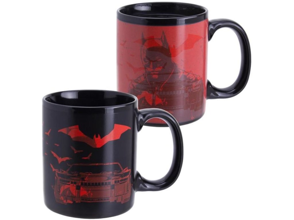 Černý keramický hrnek s grafickým potiskem komiksového hrdiny Batmana a jeho automobilu Batmobile. Po nalití horké tekutiny se potisk změní, rozsvítí se "Bat Signal" a objeví se silueta Batmobilu. Zabaleno v papírové - kartonové krabičce.