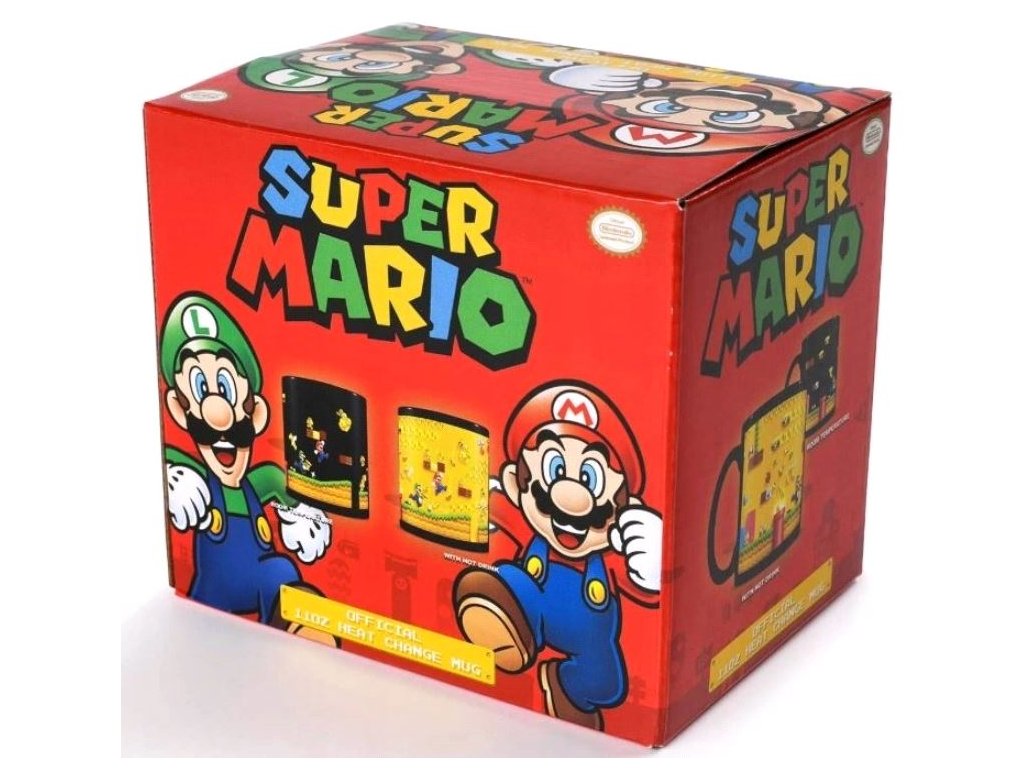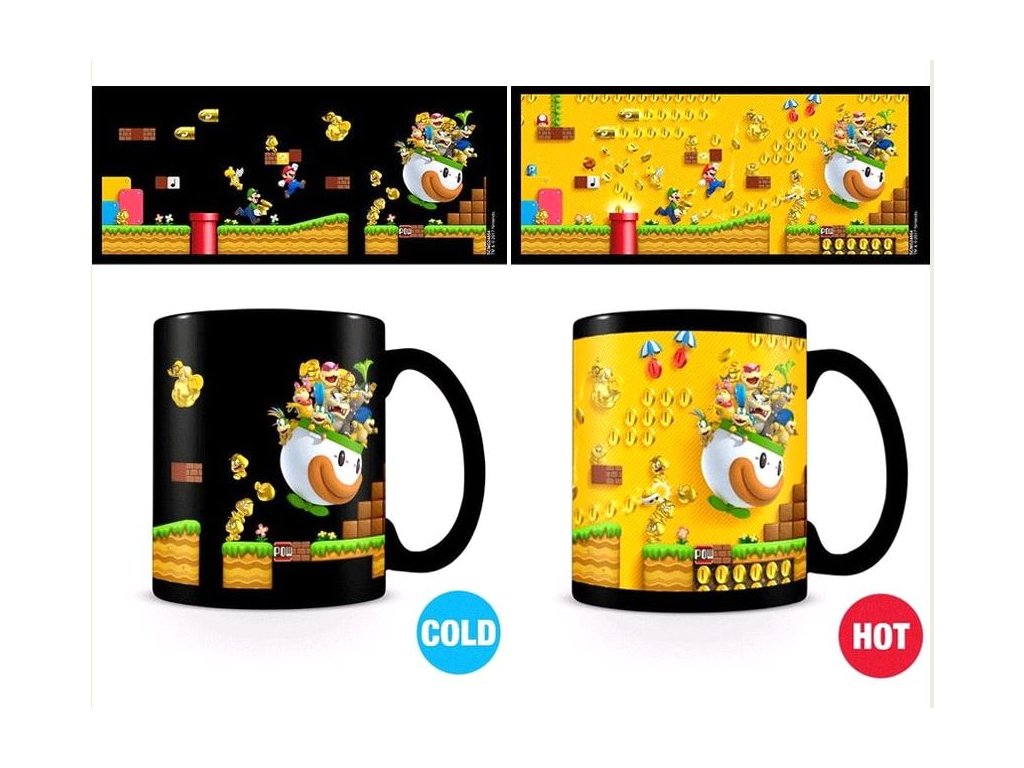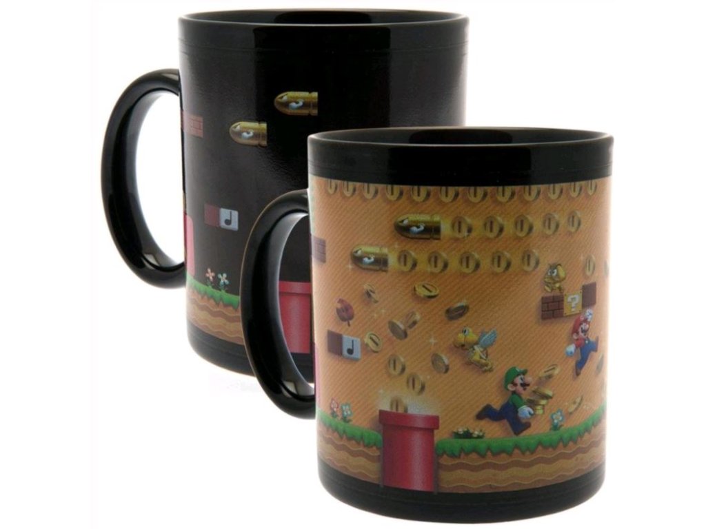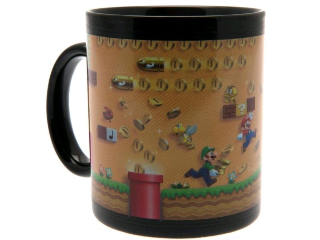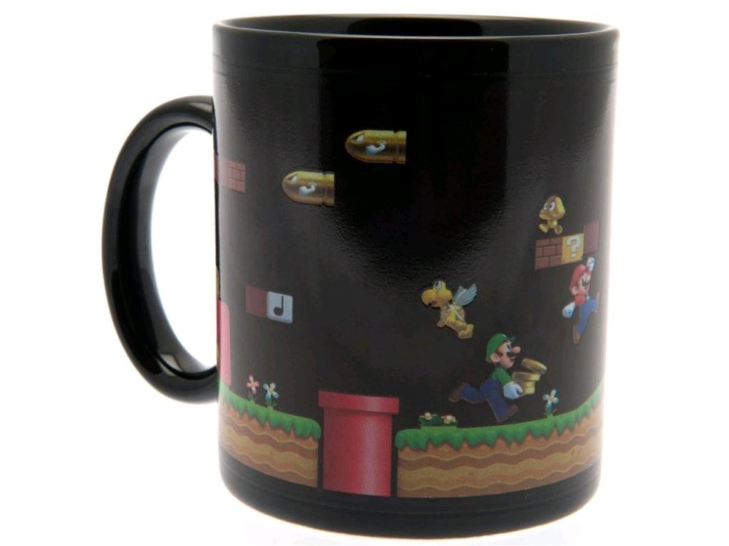 Černý keramický hrnek s grafikou počítačové hry Super Mario. Hrnek po nalití horké tekutiny mění grafiku.