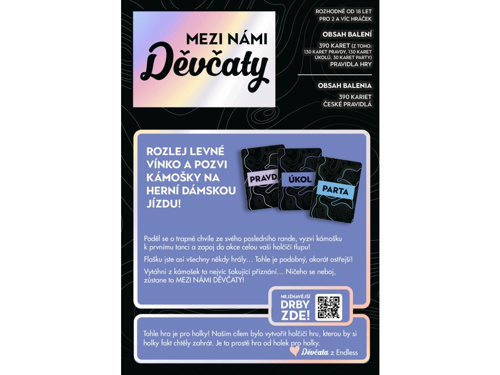 Poděl se o trapné chvíle ze svého posledního rande, vyzvi kámošku k prvnímu tanci a zapoj do akce celou vaši holčičí tlupu! Flašku jste asi všechny někdy hrály… Tohle je podobný, akorát ostřejší! Vytáhni z kámošek ta nejvíc šokující přiznání… Ničeho se neboj, zůstane to MEZI NÁMI DĚVČATY!