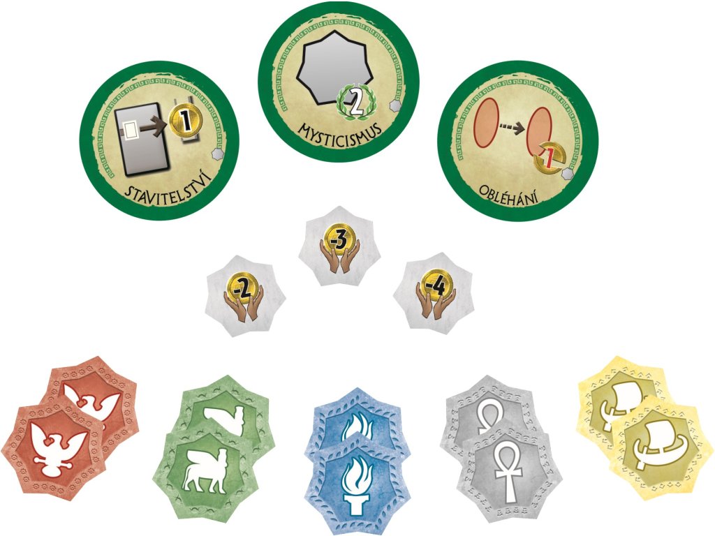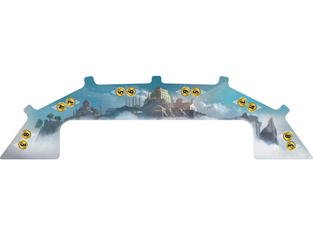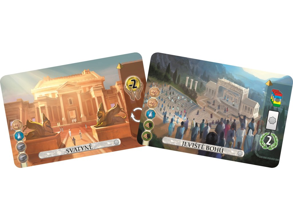 Obsah balení: 1 deska panteonu, 15 karet božstev, 1 karta brány, 5 karet velkého chrámu, 2 karty divů, 10 žetonů mytologie, 3 žetony obětin